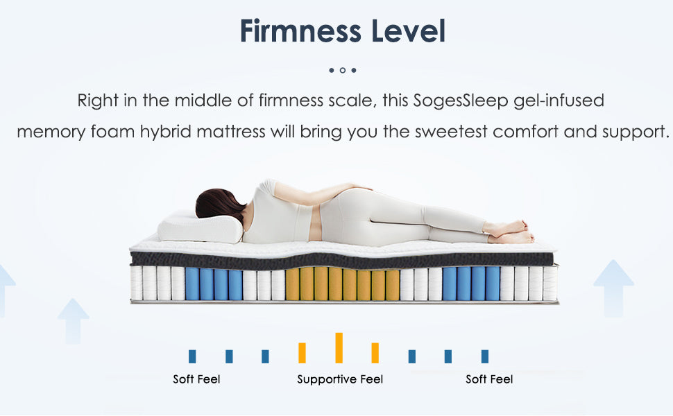 - The hybrid mattress combines gel infused memory foam and spring support system, can perfectly conform natural curves of your body and give support to lift your body into a neutral spinal alignment, relieving fatigue and pressure. Strengthened spring coils enhance edge support and prevent sagging.