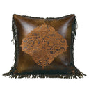 Elevate your home décor with the Austin Golden Medallion Throw Pillow, a stunning piece that effortlessly blends modern rustic charm with a touch of western elegance. Crafted from luxurious faux leather, this accent pillow features an intricately designed golden medallion at its center, showcasing exceptional craftsmanship and attention to detail. The addition of fringe trim enhances its visual appeal, making it a perfect statement piece for any room. Whether placed on a sofa, bed, or chair, this pillow adds warmth and sophistication to your living space.