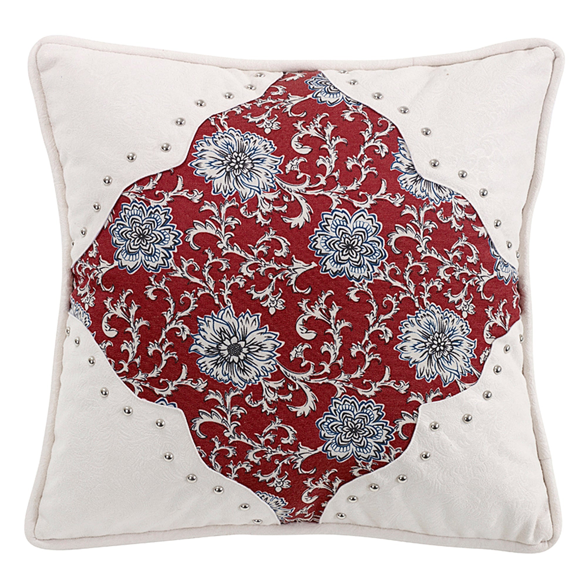 - Eye-catching center panel featuring floral medallions and scrollwork on a deep red fabric