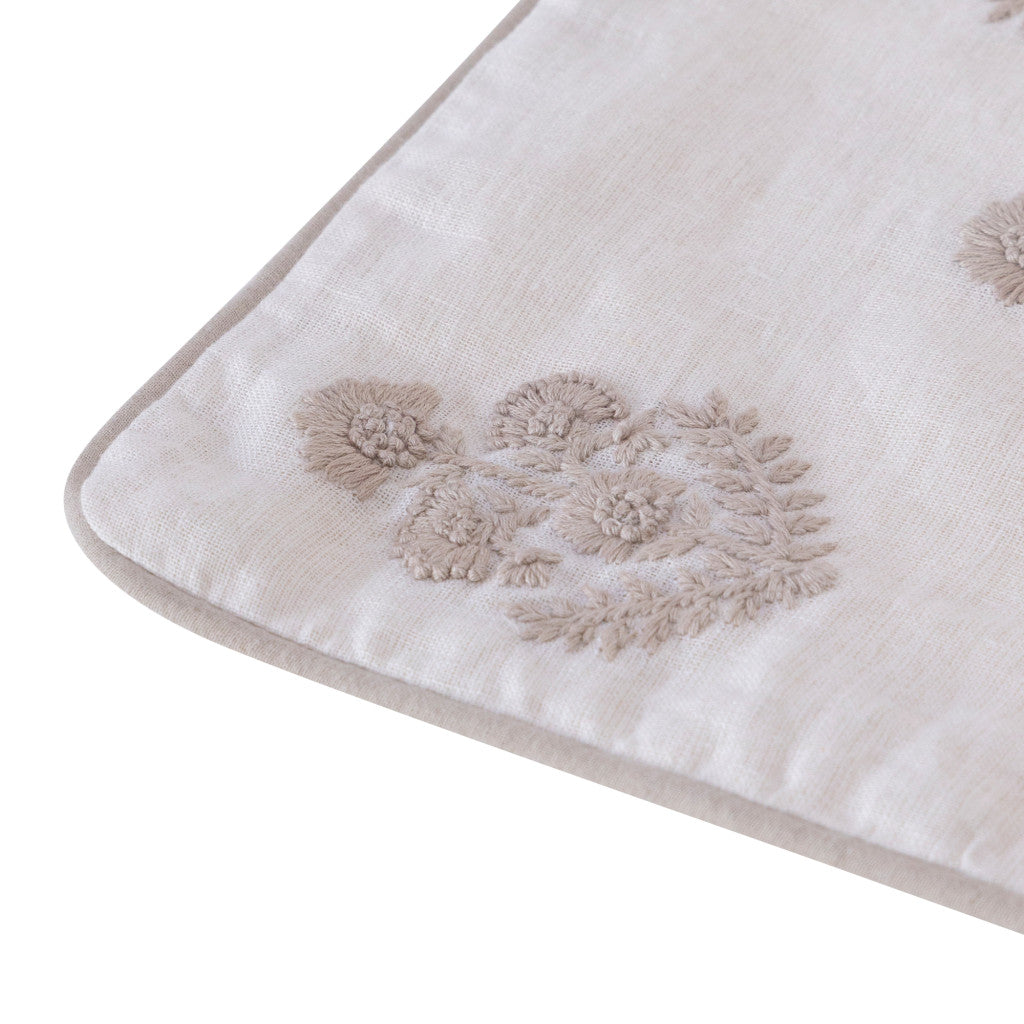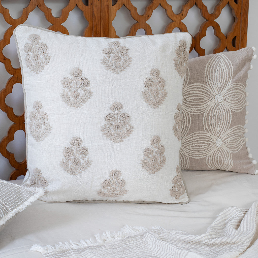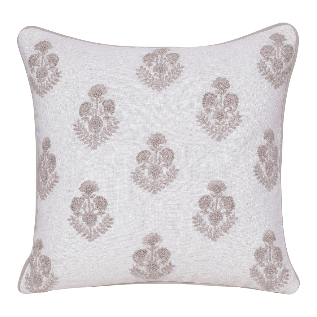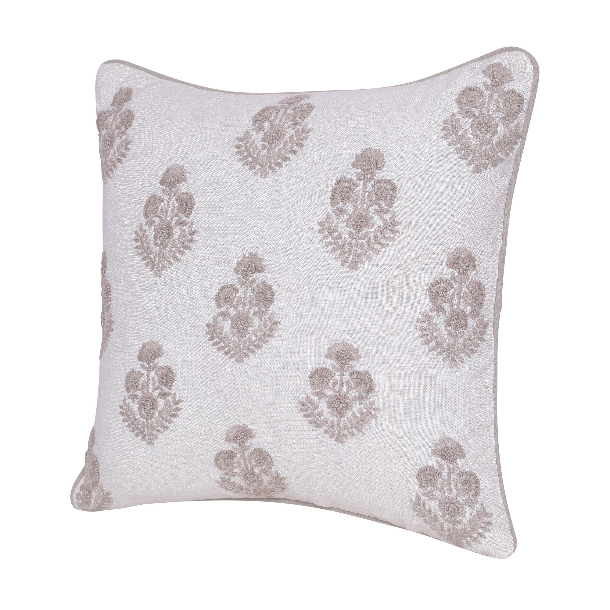 - Handmade accent throw pillow with a floral pattern and piped edges.