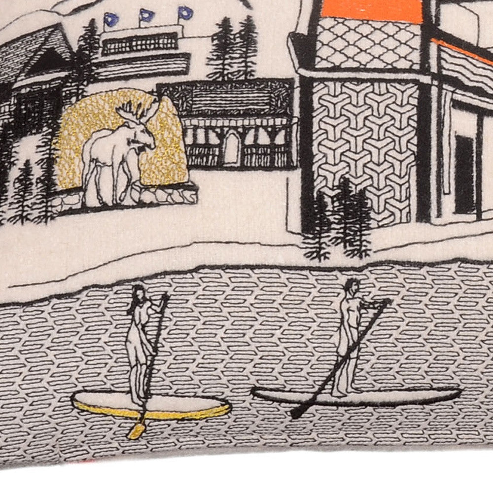 - Features an eclectic Jackson Hole Wyoming Cityscape and skyline on front with solid color on the back.