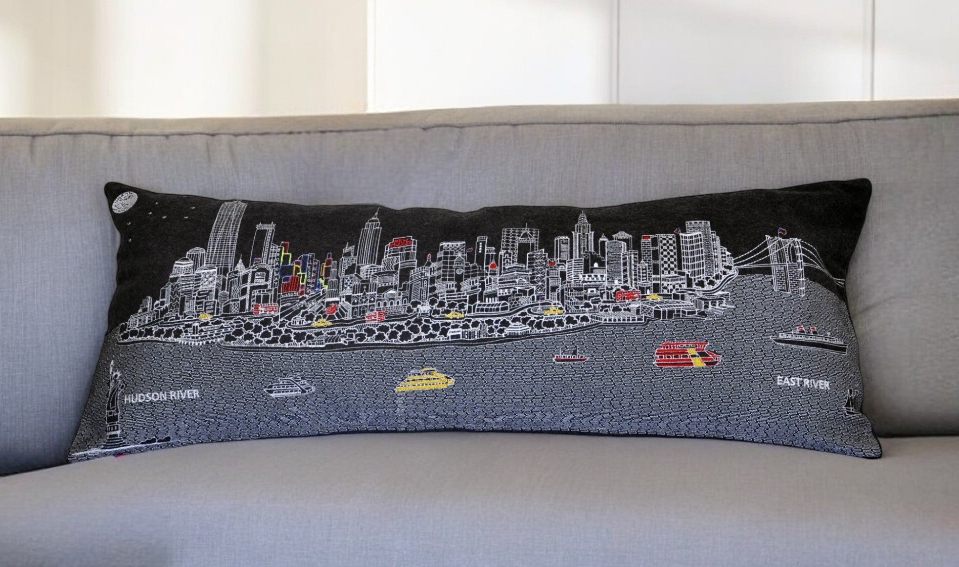 - Features an eclectic NYC New York Cityscape and skyline on front with solid color on the back.