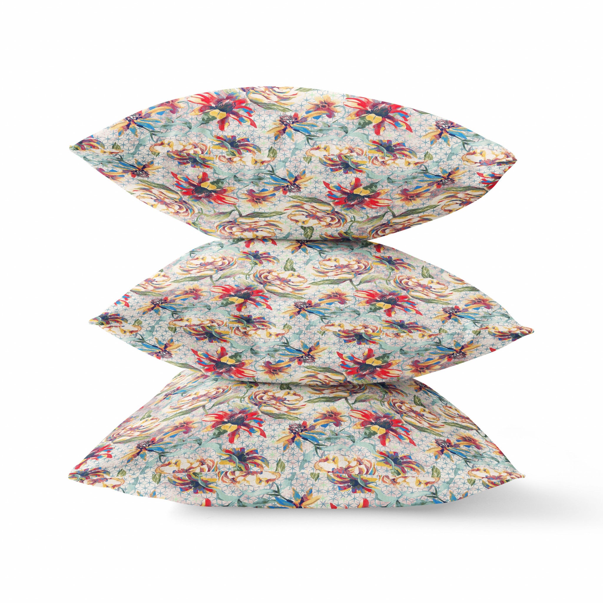 - Bohemian style pillow with a vibrant yellow and red landscape and nature design.