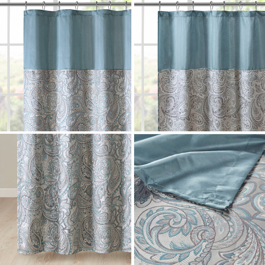 Elevate your bathroom with a refined, modern look—this jacquard shower curtain combines textured craftsmanship and contemporary patterning to create a focal point that’s both stylish and easy to maintain. Its woven paisley motif and contrasting solid top stripe add depth and sophistication while the durable polyester construction ensures long-lasting performance.