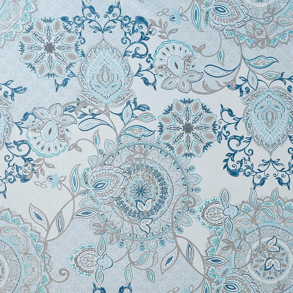 - Design: Printed floral and medallion motif in soft blue and neutral watercolor hues