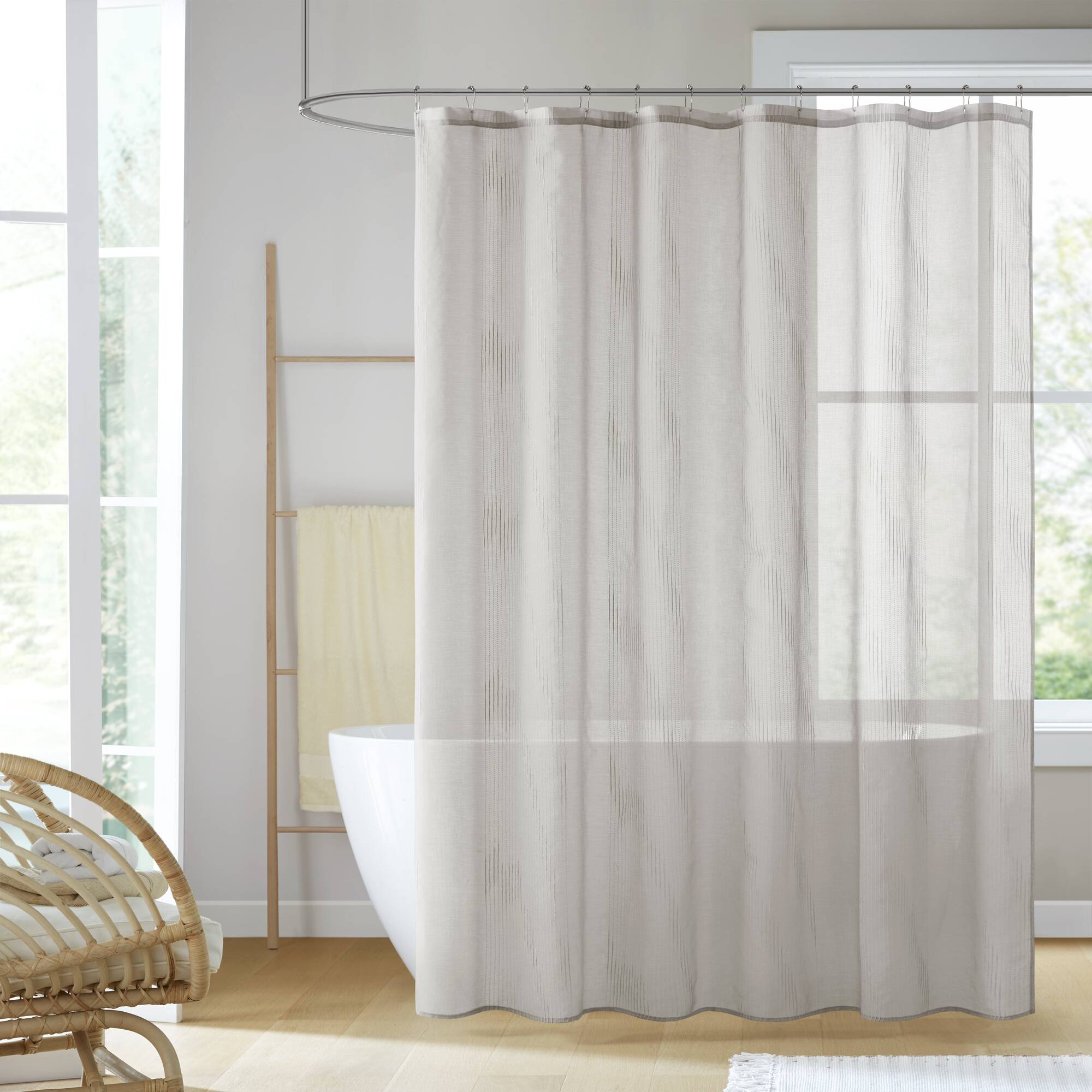 Refresh your bathroom with a light, airy look that softly filters light while adding subtle texture and modern style. This sheer shower curtain features a delicate striped weave and a gentle grey tone to bring depth and a refined, contemporary feel to your space. Use with an opaque liner when privacy or a more solid appearance is desired.
