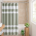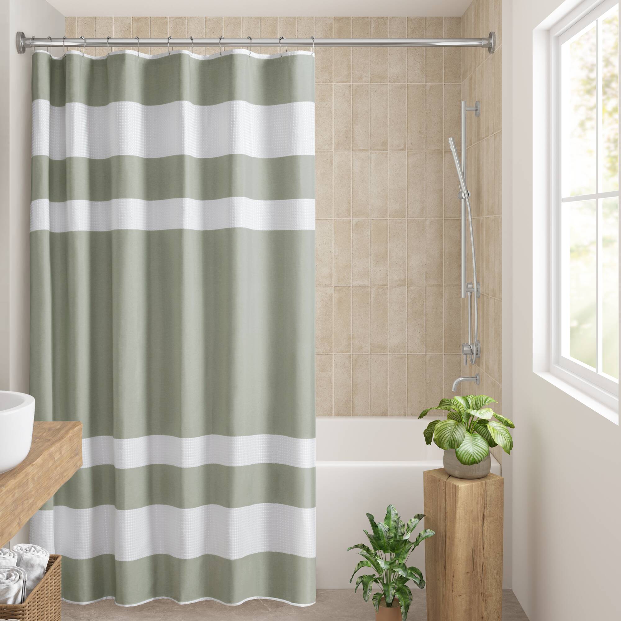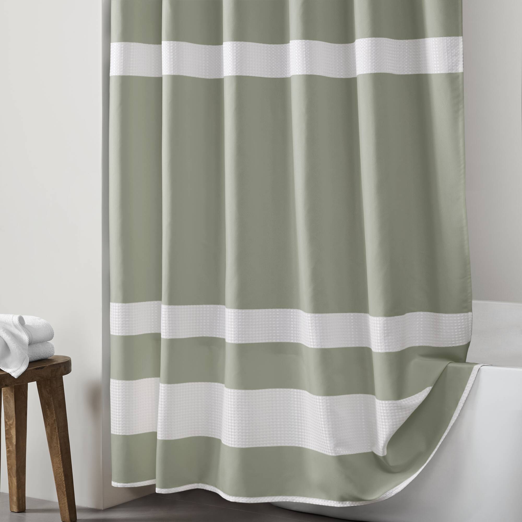 Bring a spa-like calm to your bathroom with this textured waffle shower curtain, updated with a modern stripe detail and a light heathered tone. The soft woven fabric layered over a white waffle-weave base creates subtle depth and an airy, boutique feel while the temporary 3M Scotchgard water-repellent treatment helps protect the fabric and extend its appearance through multiple washes.