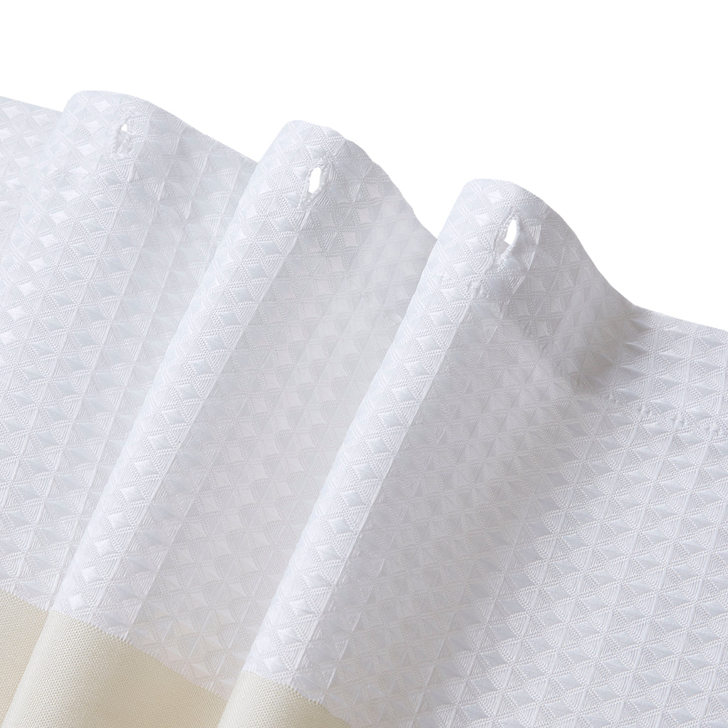 Bring a spa-like calm to your bathroom with this textured waffle shower curtain, updated with a modern stripe detail and a light heathered tone. The soft woven fabric layered over a white waffle-weave base creates subtle depth and an airy, boutique feel while the temporary 3M Scotchgard water-repellent treatment helps protect the fabric and extend its appearance through multiple washes.