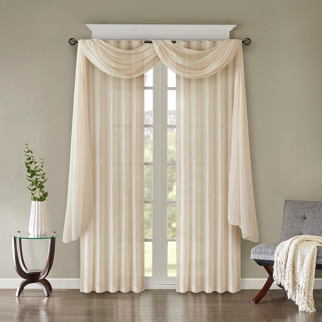 Bring airy, modern elegance to any room with the Madison Park Harper Solid Crushed Window Panel Pair. Crafted from a lightweight cream sheer with subtle crushed texture, these panels softly filter light while adding visual depth. Versatile hanging options let you create a relaxed or tailored look, and the neutral tone makes them easy to layer with coordinating scarves or prints for a custom window treatment.