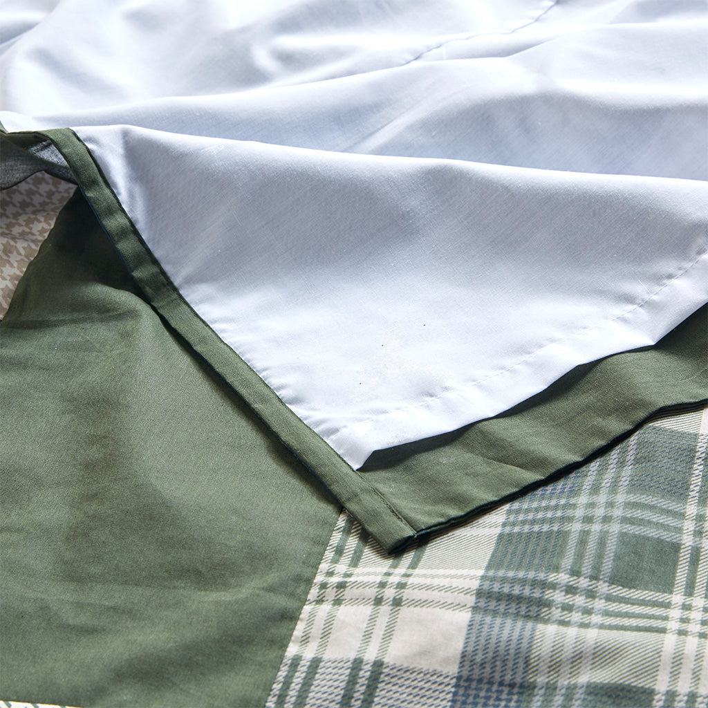 - Design: Pieced plaid patchwork in green, navy, and taupe for a cozy cabin/lodge aesthetic