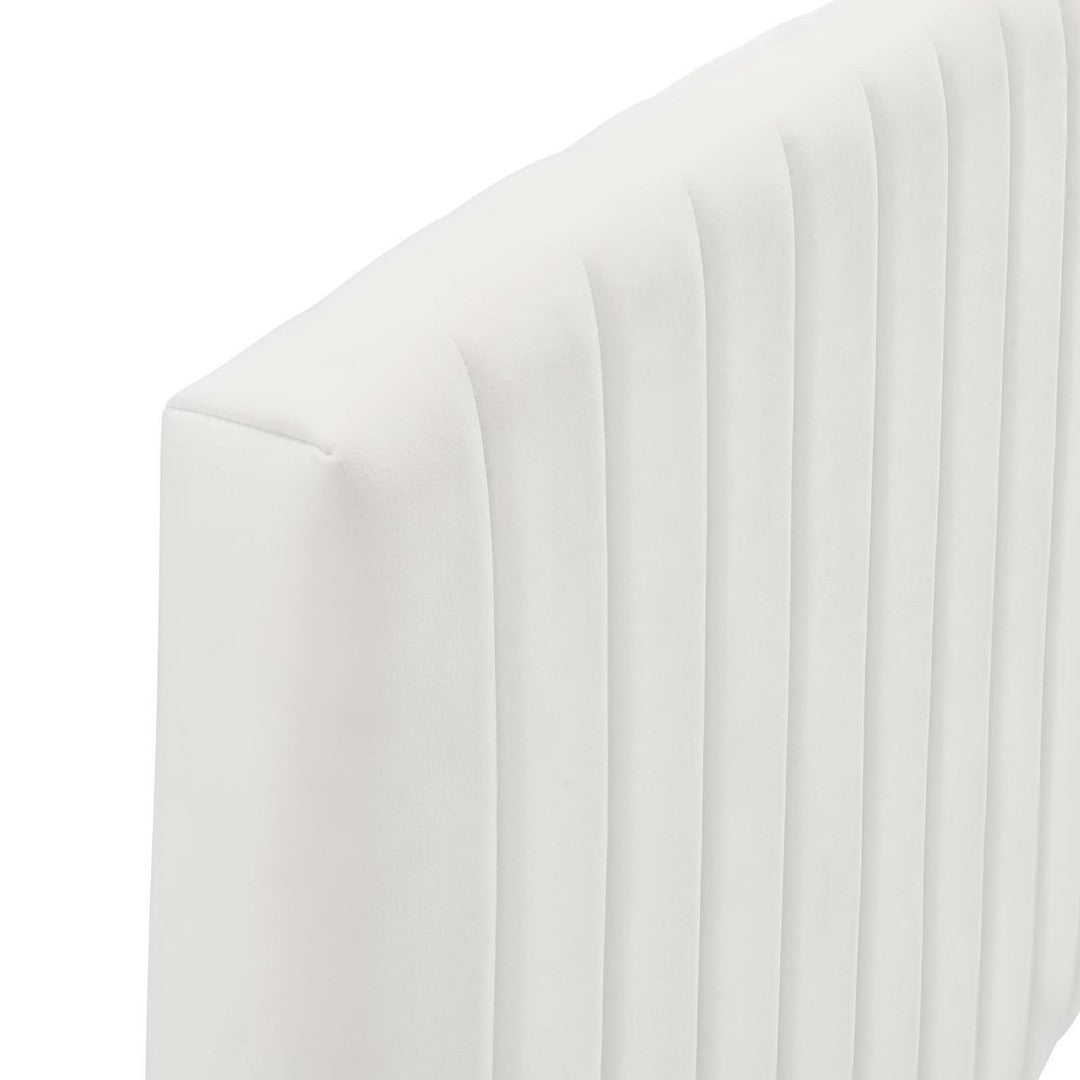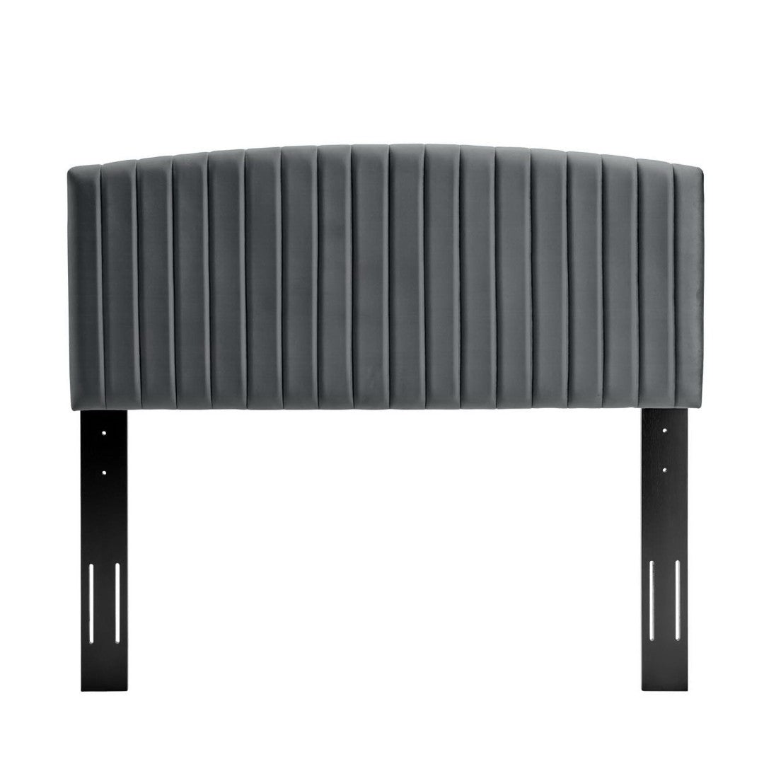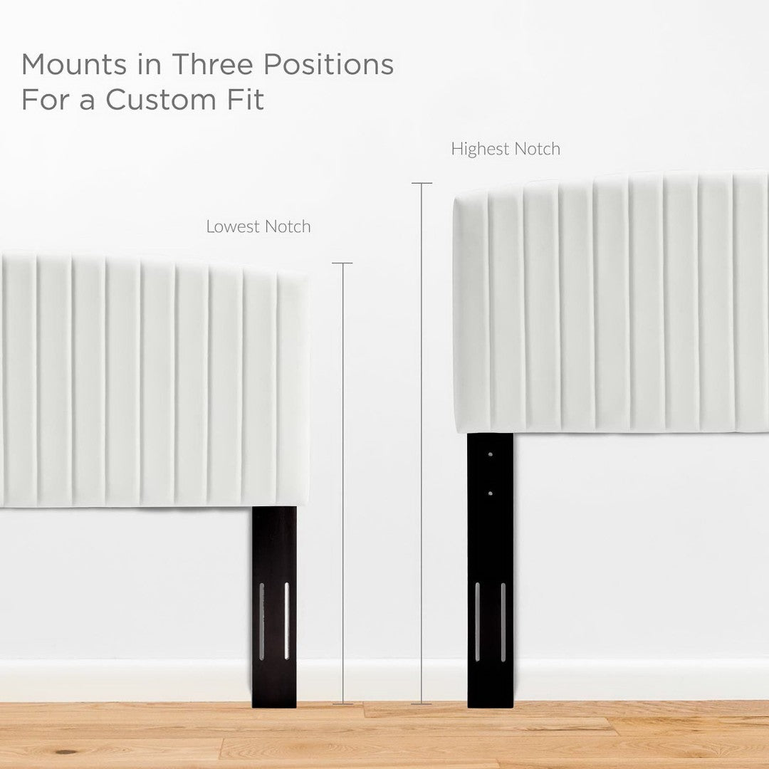 - Glam Deco Headboard Performance Velvet Polyester Upholstery Vertical Striped Channel Tufting Durable Stain-Resistant Fabric Solid Wood and Particleboard Frame Dense Foam Padding Mounts in Three Positions