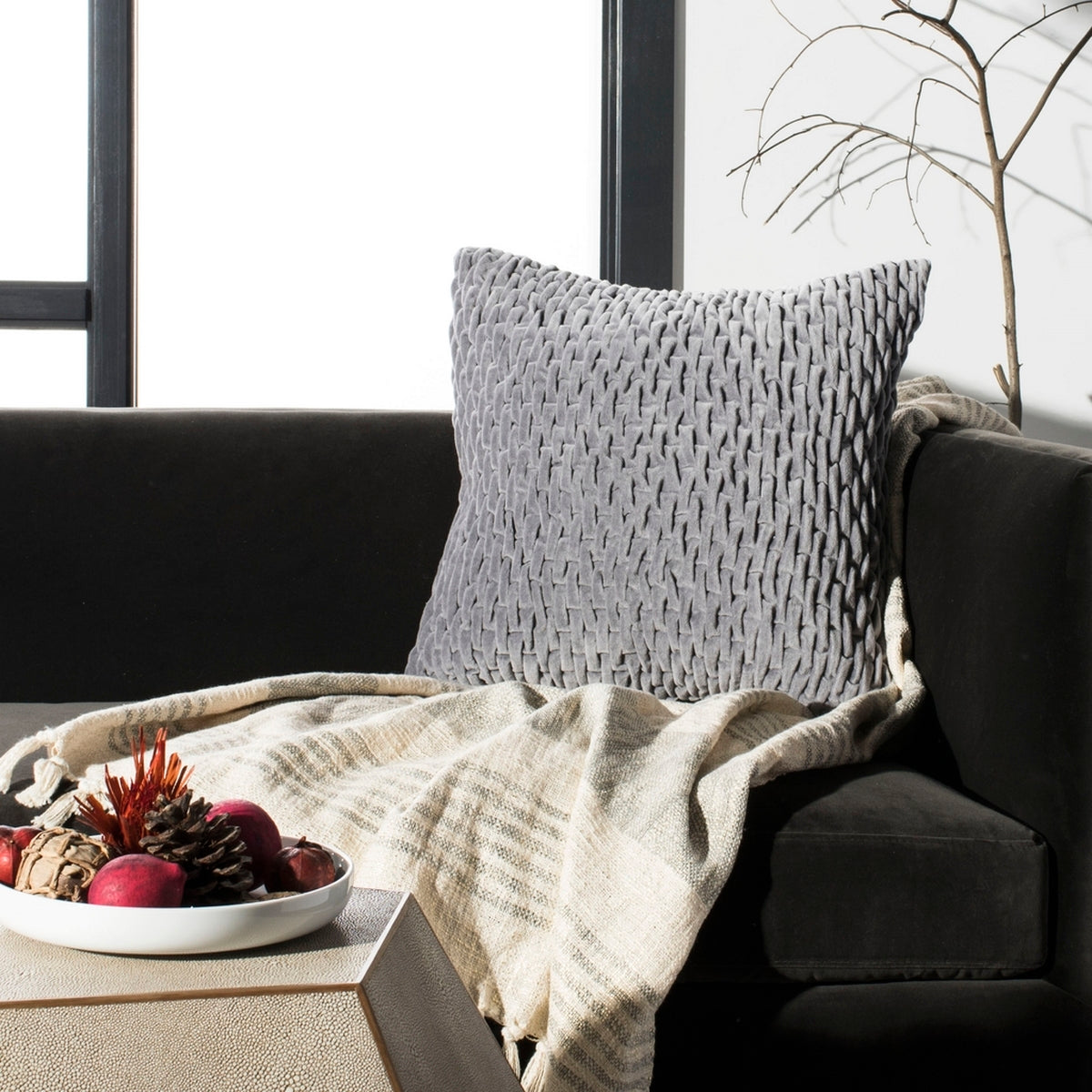 Pillows tend to flatten during transit, but these tips should help you get that pillow into its fluffiest shape quickly! Once unpacked, gently knead the pillow to help loosen the fibers. Throw the pillow in a dryer on a low tumble setting. The most important tip is to include a sock stuffed with a tennis ball to help "beat" the pillow into its fluffy form. Remove from the dryer, and proudly display your new piece of couch art!