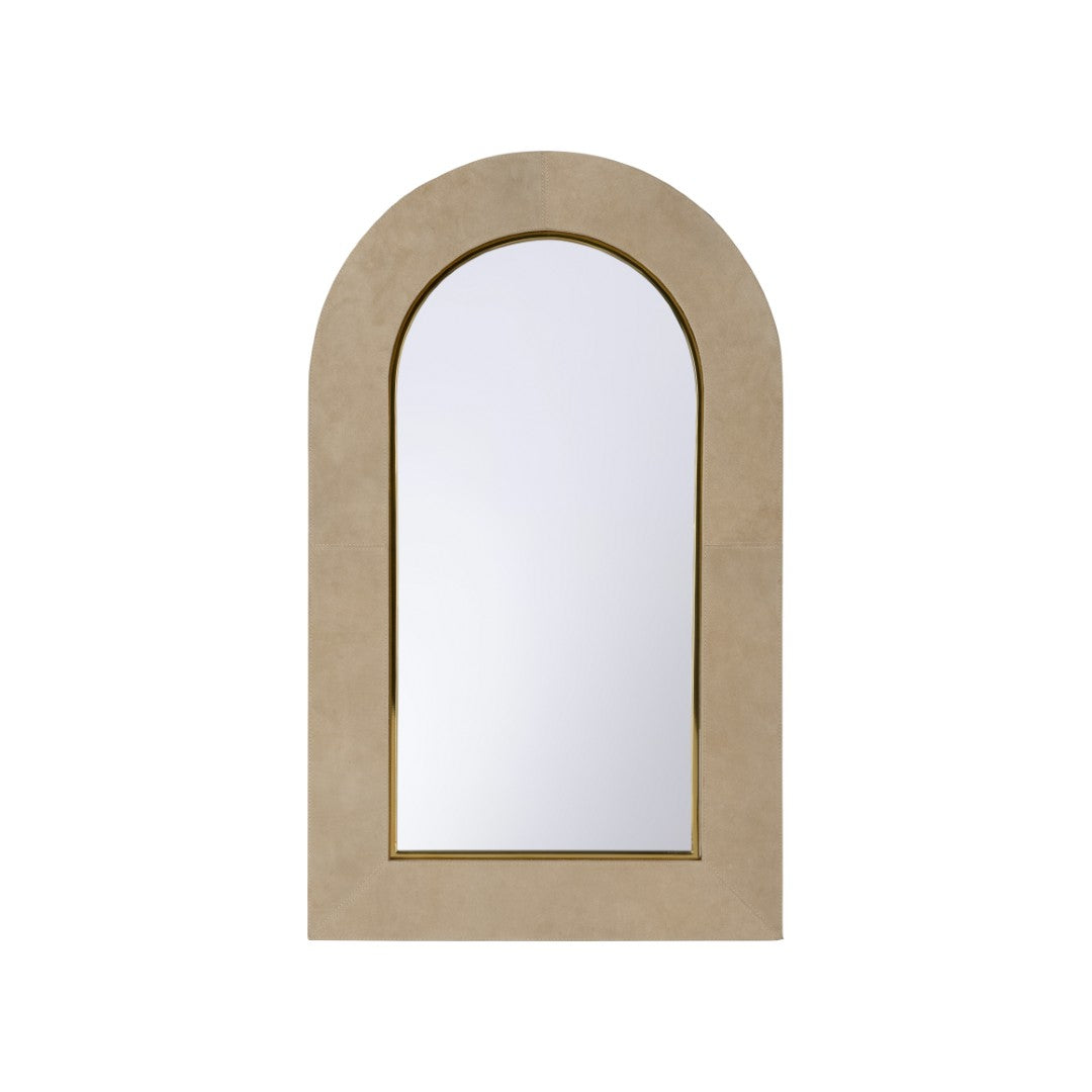 Elevate your space with the Harrison Mirror — a refined accent that blends classic arched silhouette with modern materials for a versatile, upscale look. The cream suede frame and polished brass detailing create a warm, dimensional finish that complements contemporary and traditional interiors alike. Perfect for entryways, living rooms, bedrooms, or bathrooms, this mirror adds light and visual height while serving as a subtle focal point.