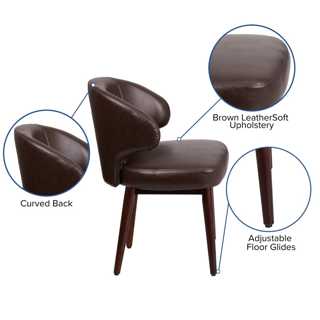 Elevate your reception area or office with this stylish brown LeatherSoft side chair that blends upscale design with everyday durability. Its enveloping curved back and high walnut legs create a welcoming, contemporary silhouette—perfect for reception areas, reading nooks, extra seating, or filling unused corners—while LeatherSoft upholstery delivers a soft, long-lasting finish that’s easy to maintain.