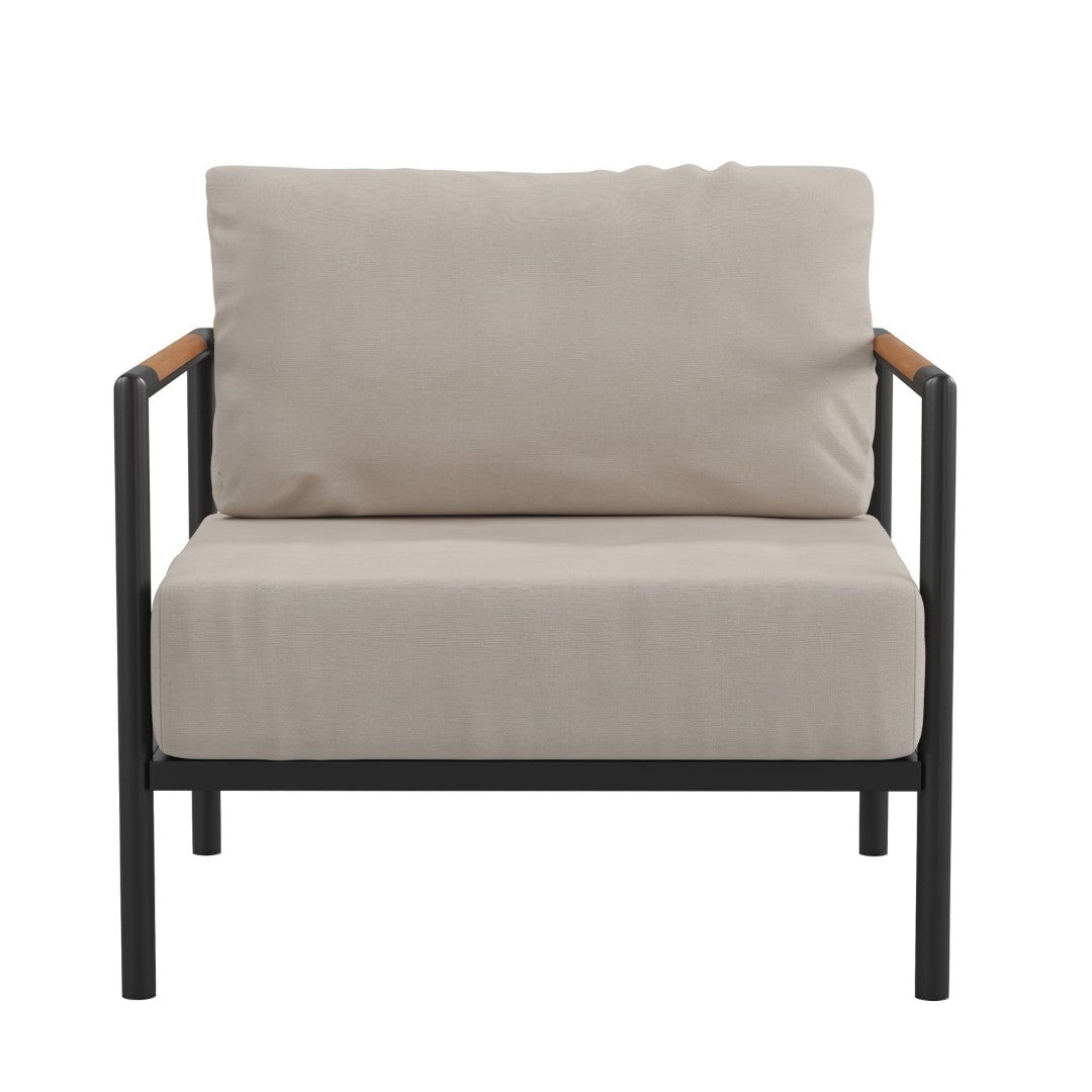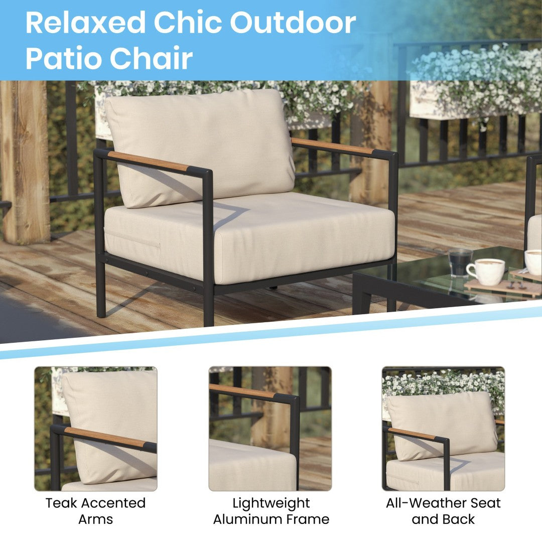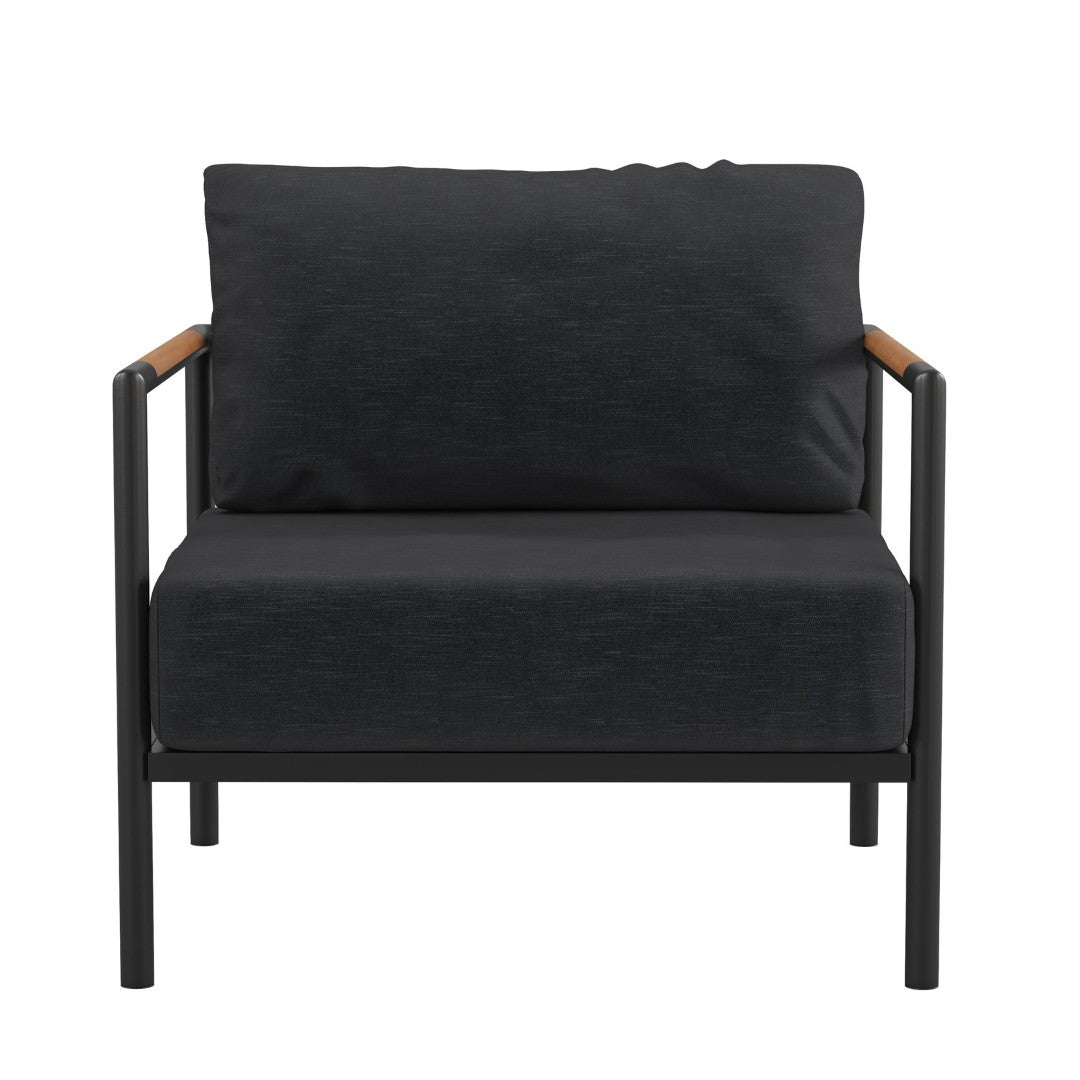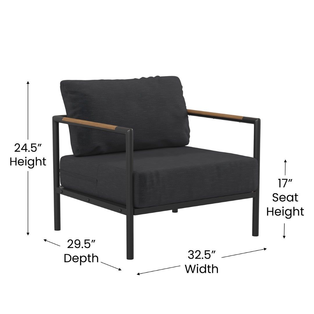 Enjoy relaxed, all-season seating with this modern indoor/outdoor patio chair — a stylish blend of durable materials, comfortable cushioning, and teak-accented detailing. Its lightweight powder-coated aluminum frame and removable charcoal cushions make it easy to move, maintain, and integrate into residential or commercial spaces, while thoughtful design touches like teak arms and floor glides protect surfaces and add visual warmth.