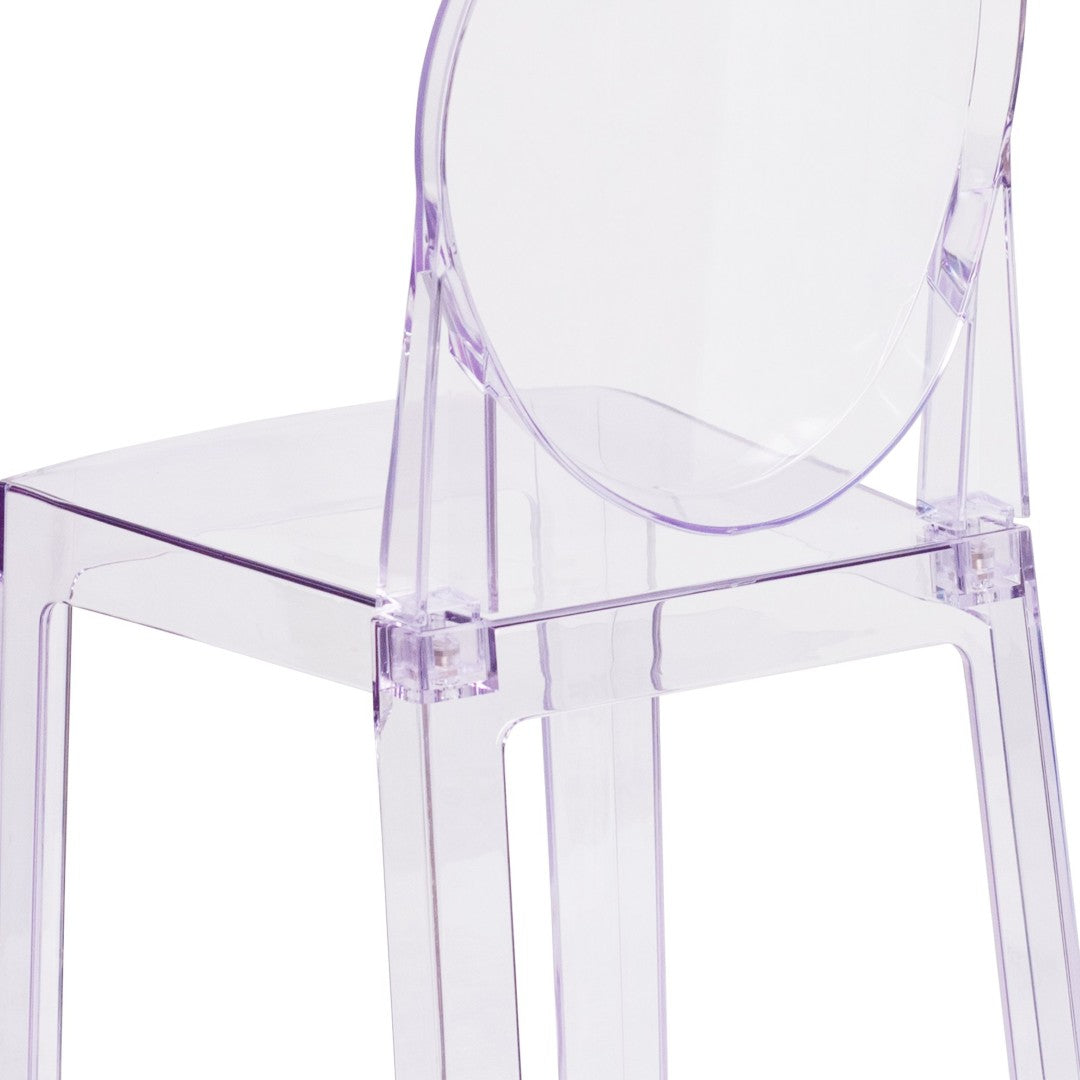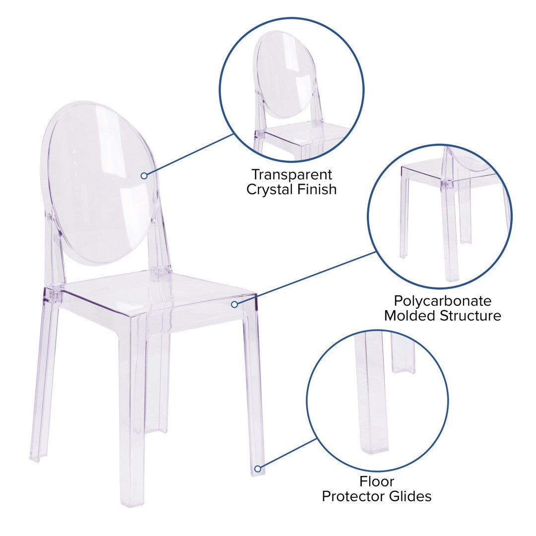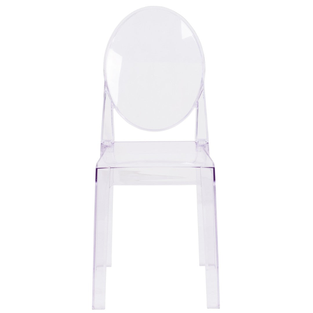 Bring modern elegance and effortless versatility to dining rooms, cafes, or event spaces with this Revna Ghost Chair. Its clear, oval-backed Louis XVI-inspired silhouette creates a light, airy feel that complements any decor while the durable polycarbonate construction delivers comfort and commercial-grade performance. Ideal for small rooms, high-traffic venues, or layered design schemes, this chair highlights surrounding furnishings and artwork without obstructing sightlines.