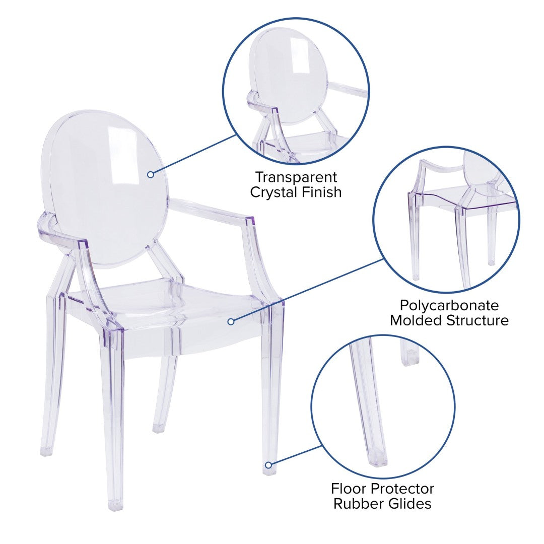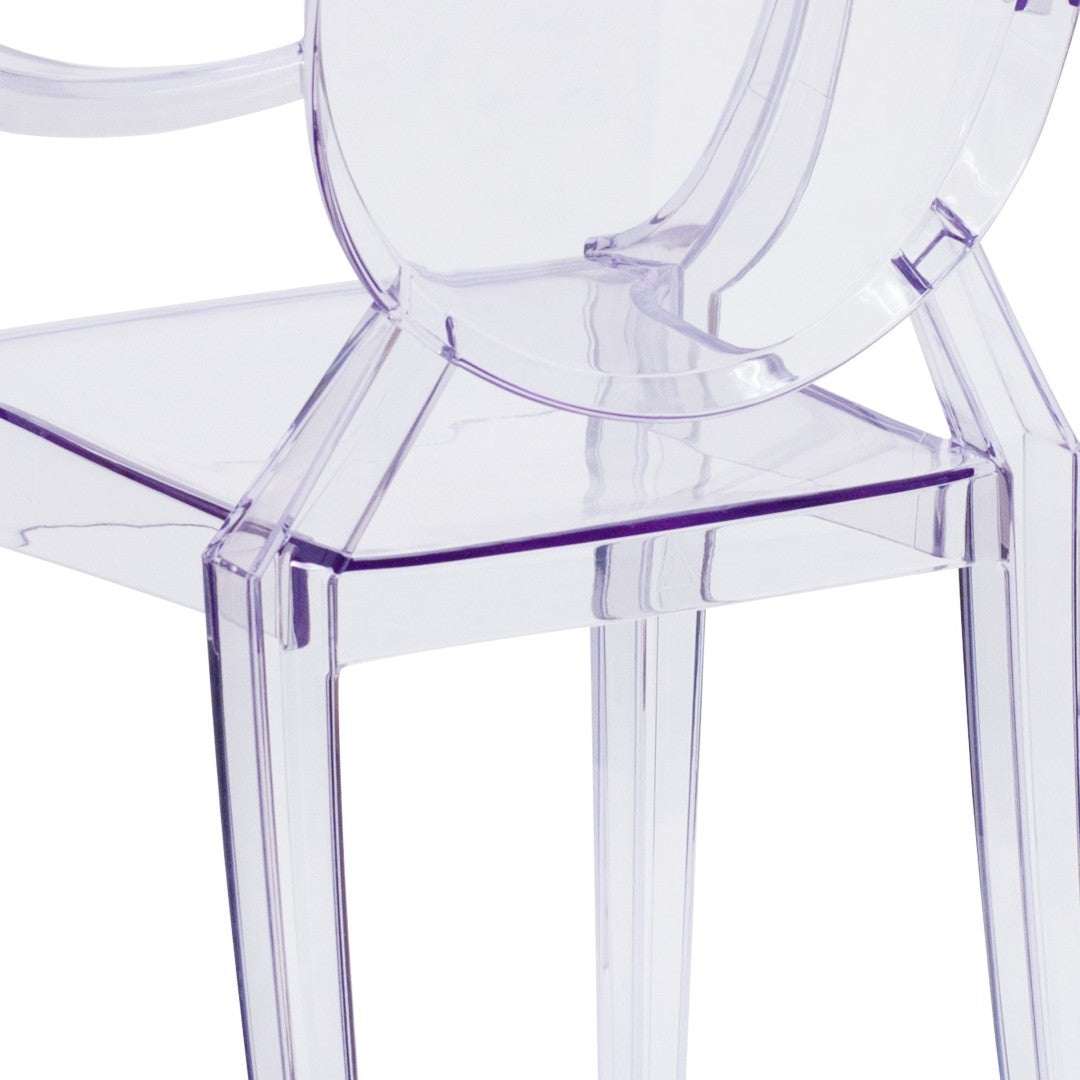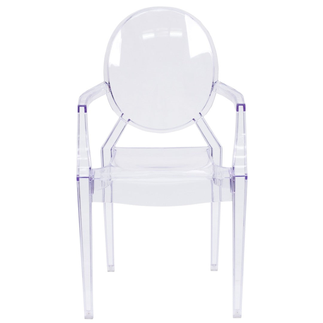 Lightweight, elegant and endlessly versatile, this transparent armchair blends Louis XVI-inspired styling with modern materials to create a statement piece that complements any decor without overpowering it. Perfect for seasonal refreshes, special events, indoor-outdoor living, or commercial settings, the Shirley Ghost Chair offers the look of traditional refinement with the practicality of contemporary design — virtually invisible in a crowded room while providing reliable comfort and durability.