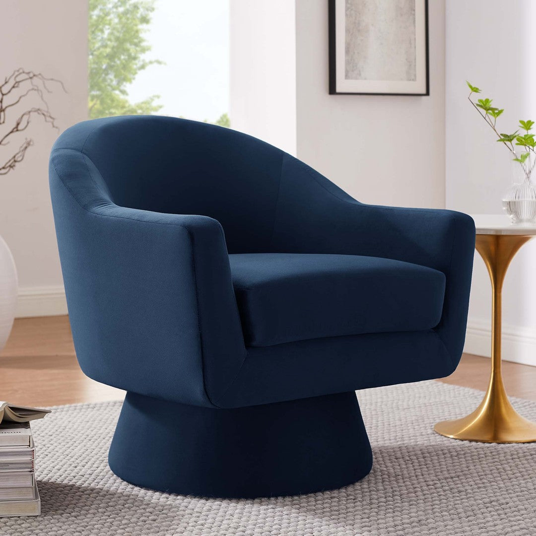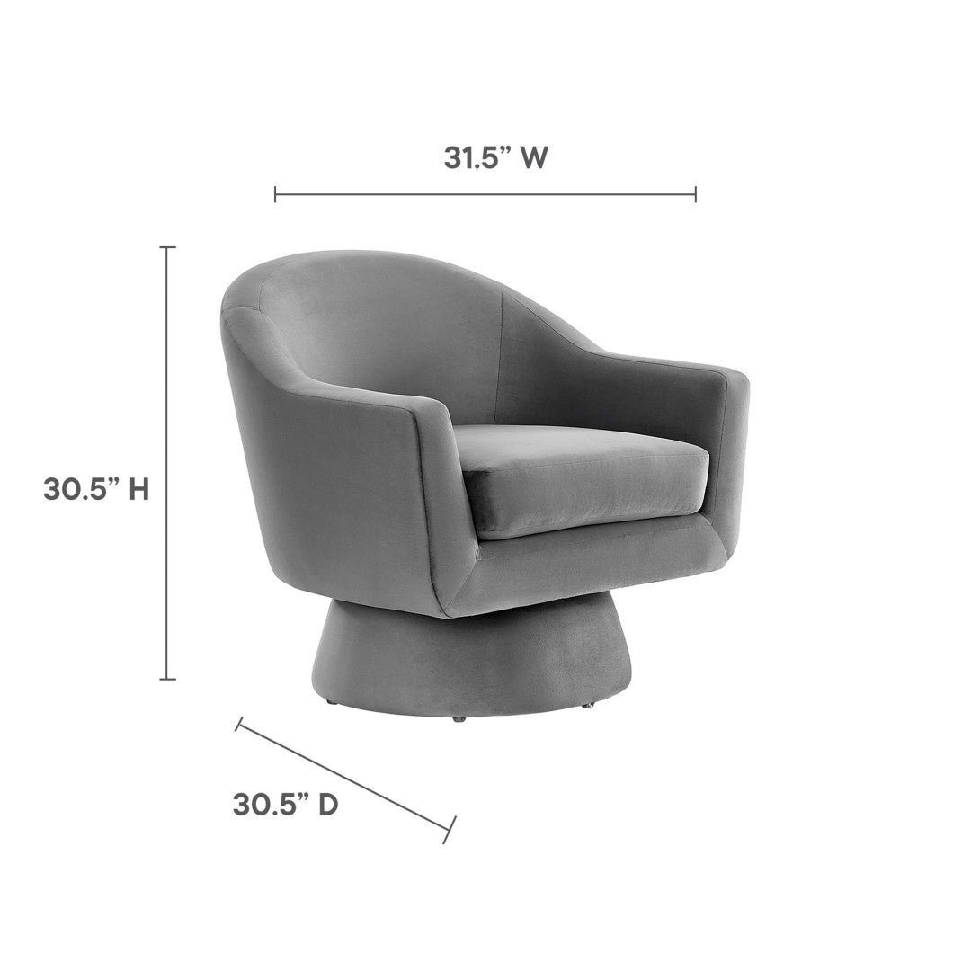 - Swivel Accent Chair Performance Velvet Fabric Stain-Resistant Upholstery 360º Swivel Base Dense Foam Padding Minimal Assembly Required