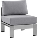 Enjoy relaxed outdoor living with the Shore Armless Outdoor Patio Aluminum Chair — a sleek, durable seating solution designed for patios, decks, and poolside lounging. Its anodized brushed aluminum frame and weather-tested canvas provide a modern look and dependable performance for everyday use and entertaining.