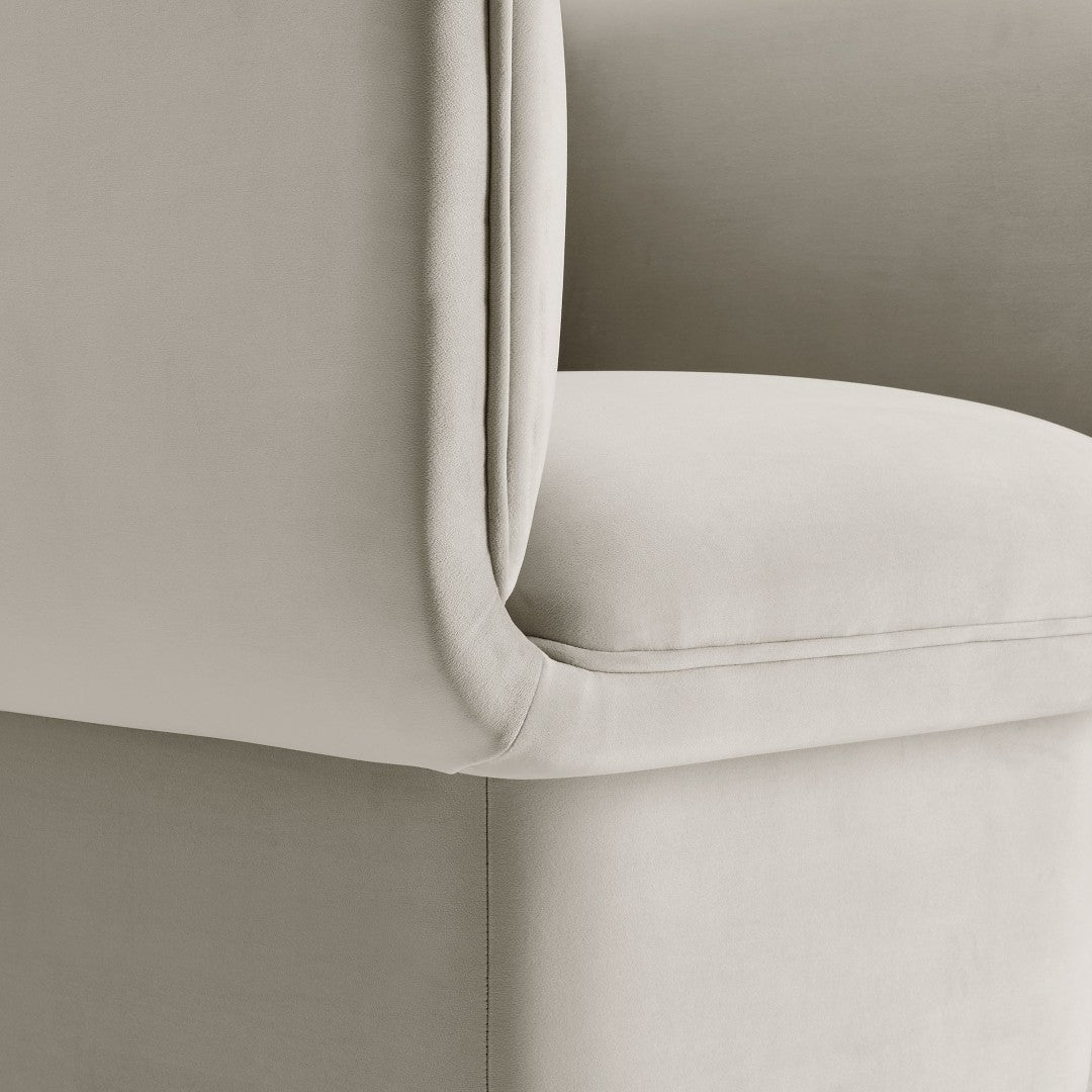 - Design Details: Barrel silhouette with wide square arms and detailed French piping for a tailored, artisanal look.