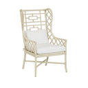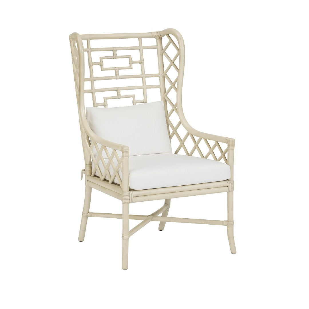 Elevate your living space with this Asian-inspired wing chair that blends timeless craftsmanship and contemporary comfort. The Gwyneth Wing Chair features a graceful rattan frame finished in a soft white with a subtle gray glaze, paired with a nubby gray velour cushion for an inviting, textured look—ideal for reading nooks, living rooms, or bedrooms seeking a serene focal point.
