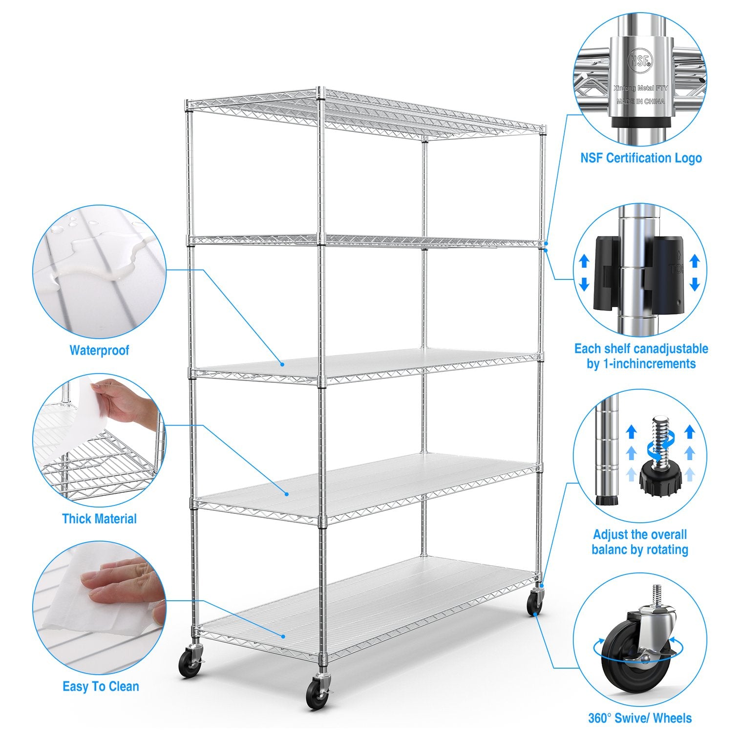 Maximize your storage with this heavy-duty, versatile 5-tier shelving unit designed for home, garage, office, or commercial use. Built from thick, rust-resistant steel and backed by NSF certification, this rack combines industrial strength with adjustable convenience — plus colorful, waterproof shelf liners to protect stored items and add visual appeal. Smooth-rolling casters and leveling feet make placement and stability easy even on uneven floors.