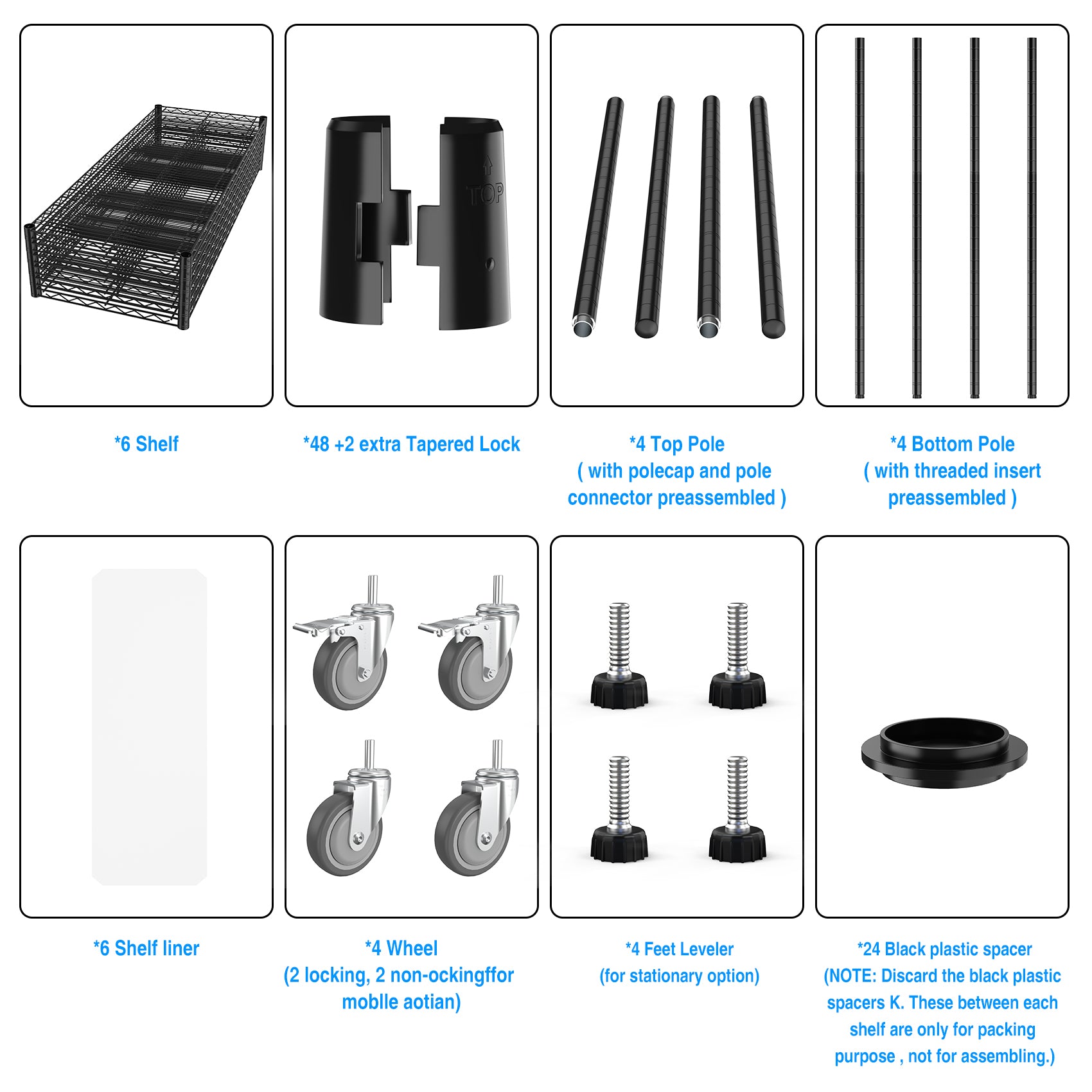 - Construction: Durable iron wire shelves with sturdy plastic components for corner/locking fittings; corrosion-resistant black finish for long-lasting use.