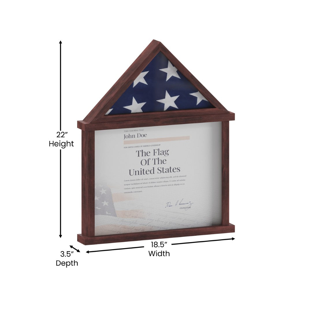 - Prominent Dimensions: 18.5"W x 3.5"D x 22.5"H — designed to fit comfortably on a mantel or wall while providing ample interior space for a folded 3x5 flag and certificate.