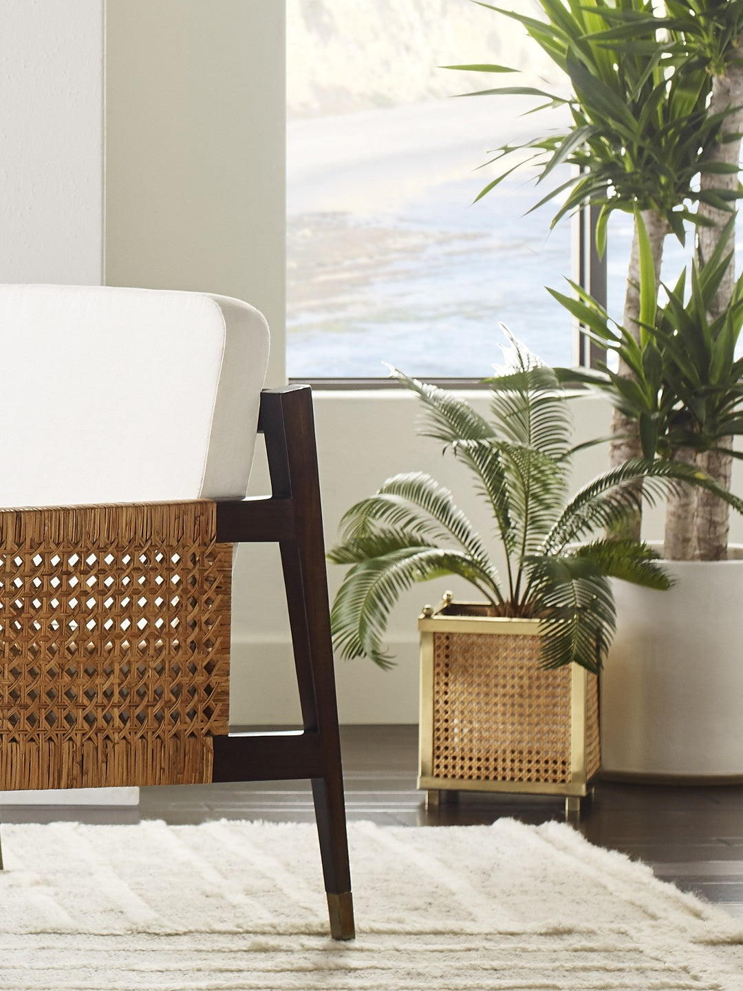 - Design details: Tapered cylindrical form with seamless brass rim and hand-applied cane for an artisanal look