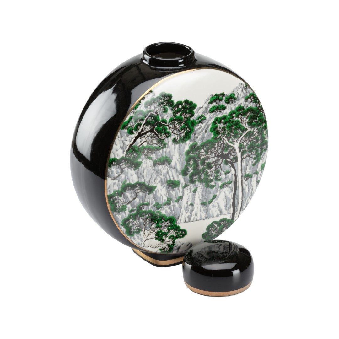 Elevate your tabletop or bookshelf with a refined chinoiserie-style accent that blends traditional charm and modern simplicity. This compact ceramic vase features a delicate green-and-white landscape decal and a removable lid, making it both decorative and functional for small arrangements or as a standalone statement piece.