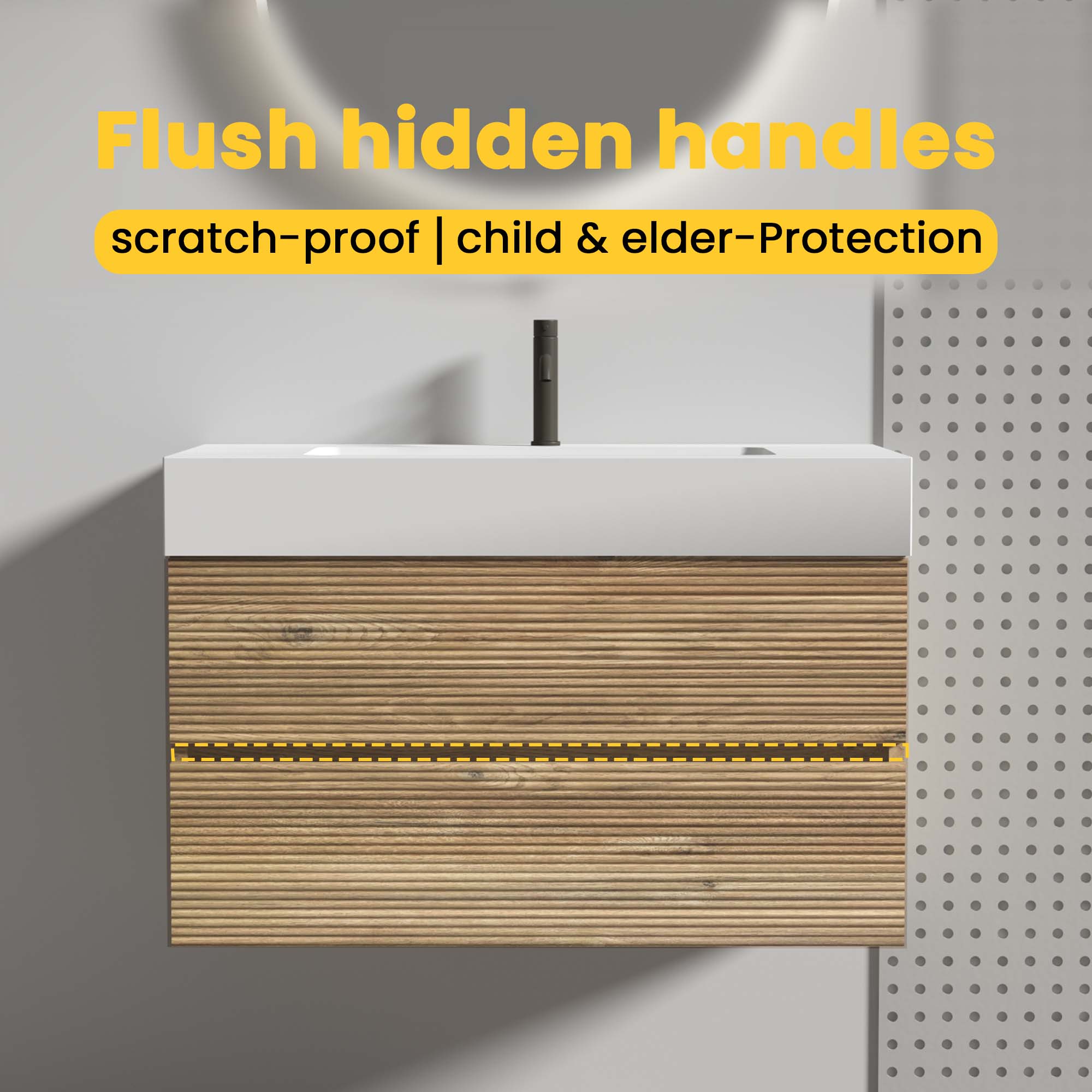 - [Child & Elderly Safety] Hidden handle in the middle eliminates scratches, offering maximum protection for children and elderly users. Two drawers feature a U-shaped ultra-thin drainage hole, providing ample storage space for all your bathroom essentials.