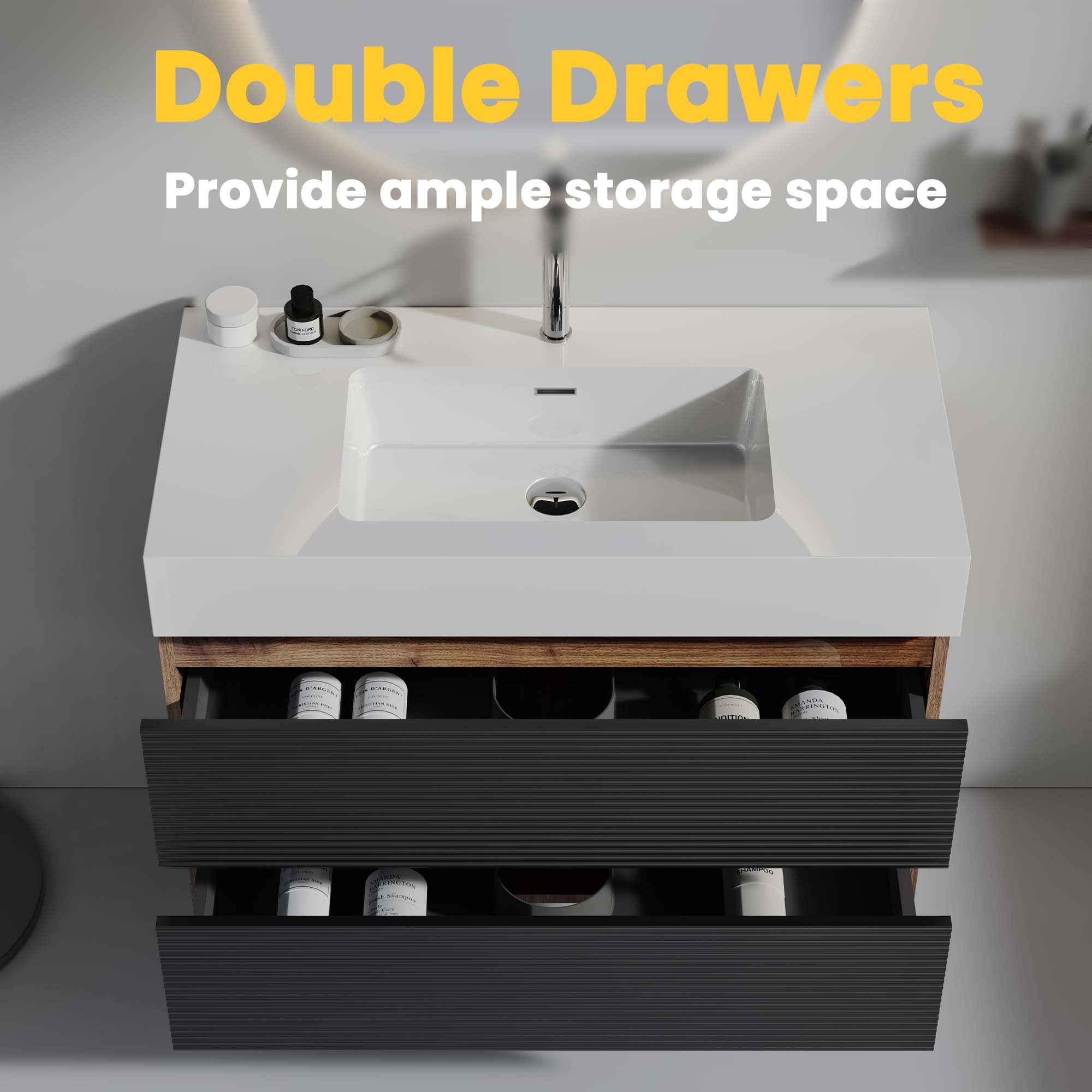 - Storage Capacity: Two deep U-shaped drawers with ultra-thin drainage cutouts, providing approximately 20% more storage capacity versus comparable models—ideal for toiletries, towels, and daily essentials.