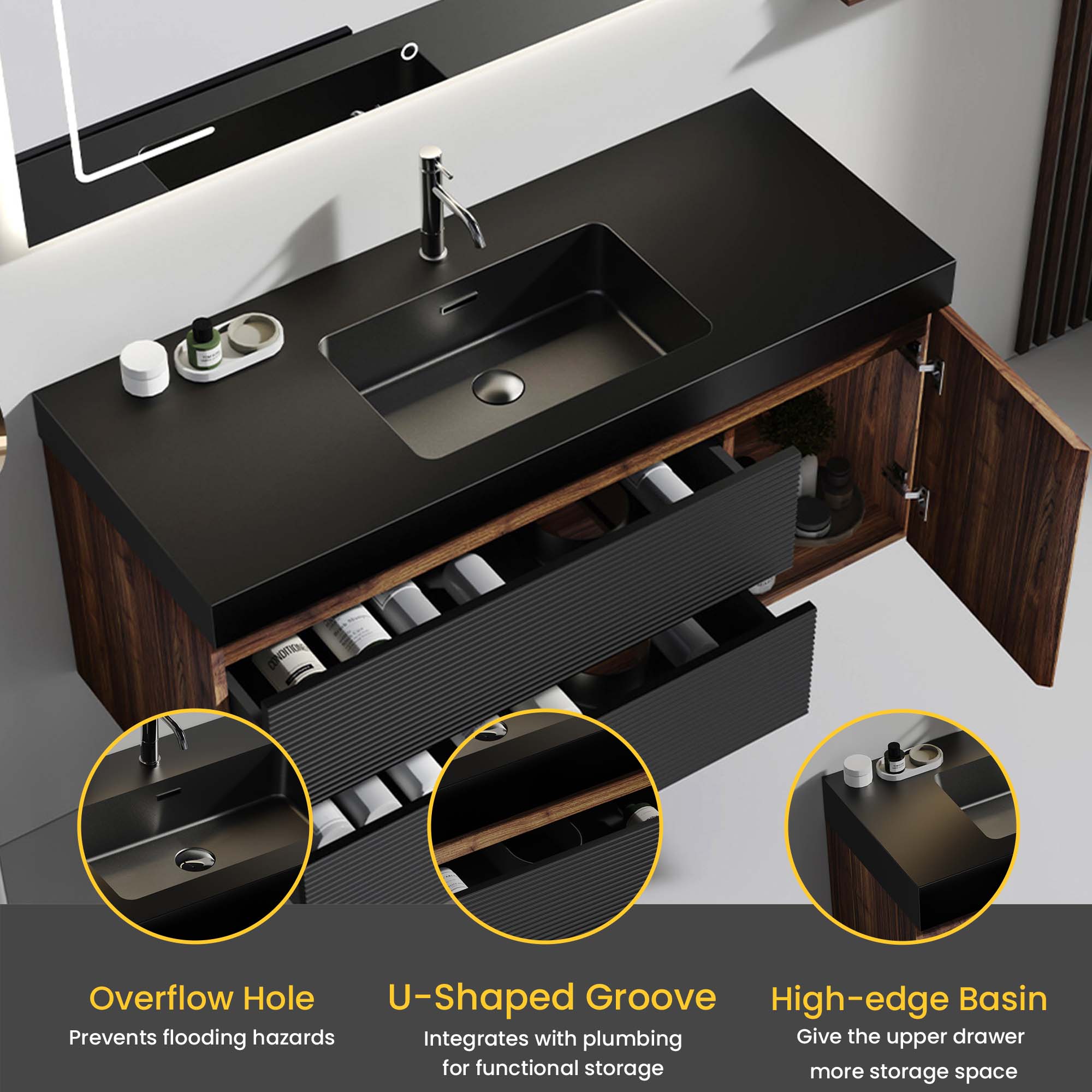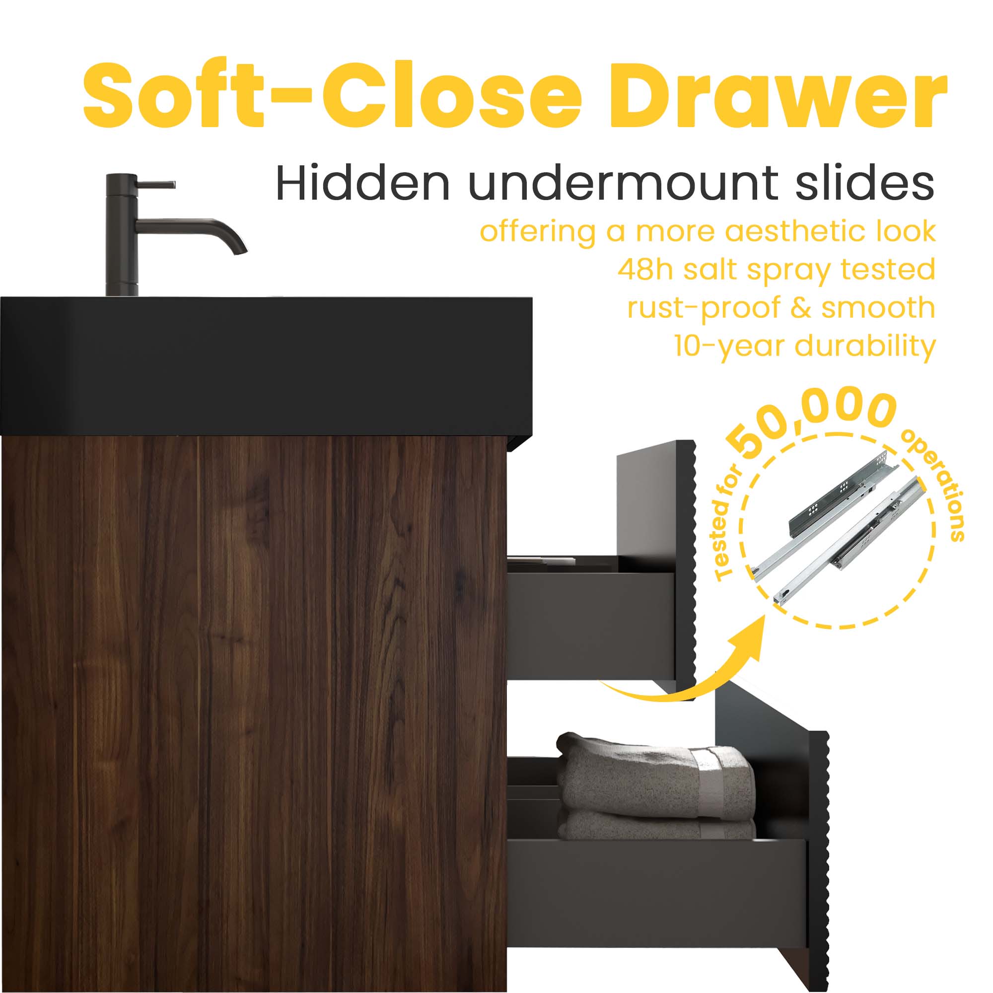 - Storage details: Two drawers feature U-shaped ultra-thin drainage cutouts and DTC silent soft-close hardware; single door provides concealed shelving space