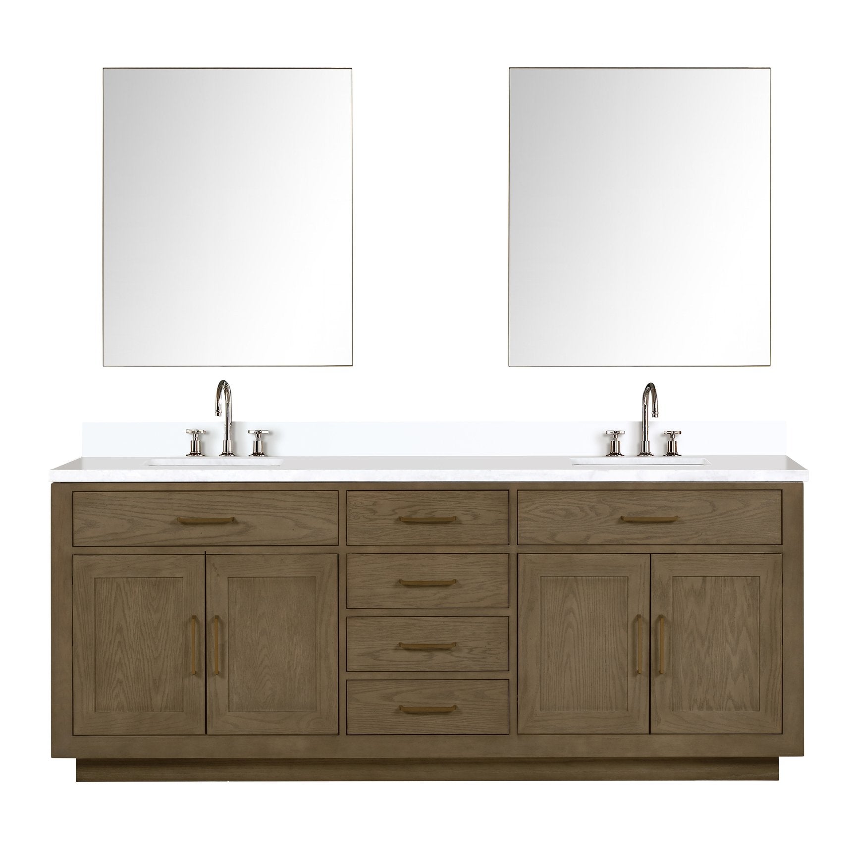 Upgrade your bathroom with this elegant Grey Oak double vanity set—designed for style, convenience, and ready-to-install functionality. The set pairs a spacious double-sink cabinet with a durable cultured marble top, two matching frameless mirrors, and chrome gooseneck faucets to deliver a cohesive, contemporary look and exceptional value for large bathrooms or master suites.