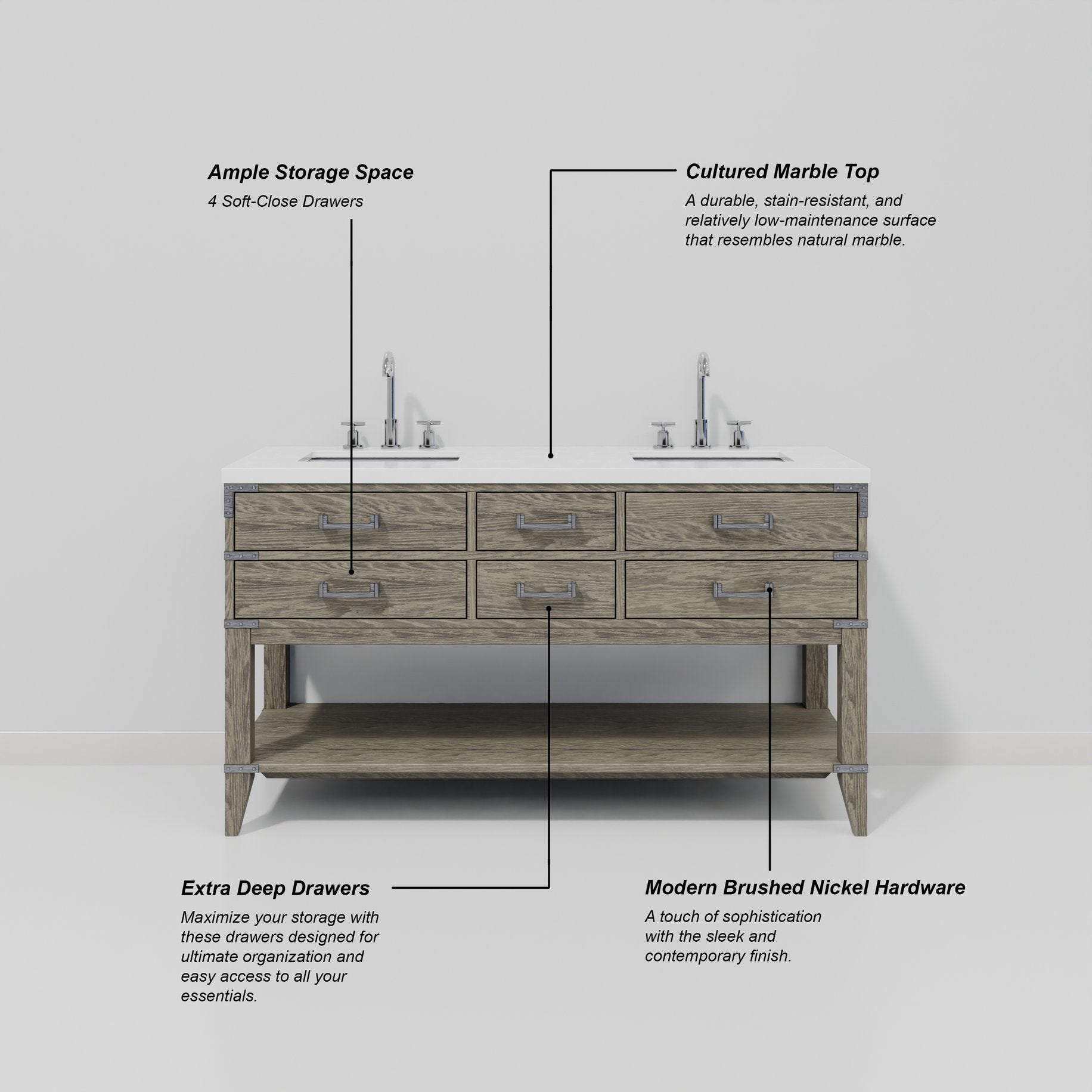 - Color & material: Grey oak wood cabinet with hand-finished, polished cultured marble tops sealed twice for durability and stain resistance