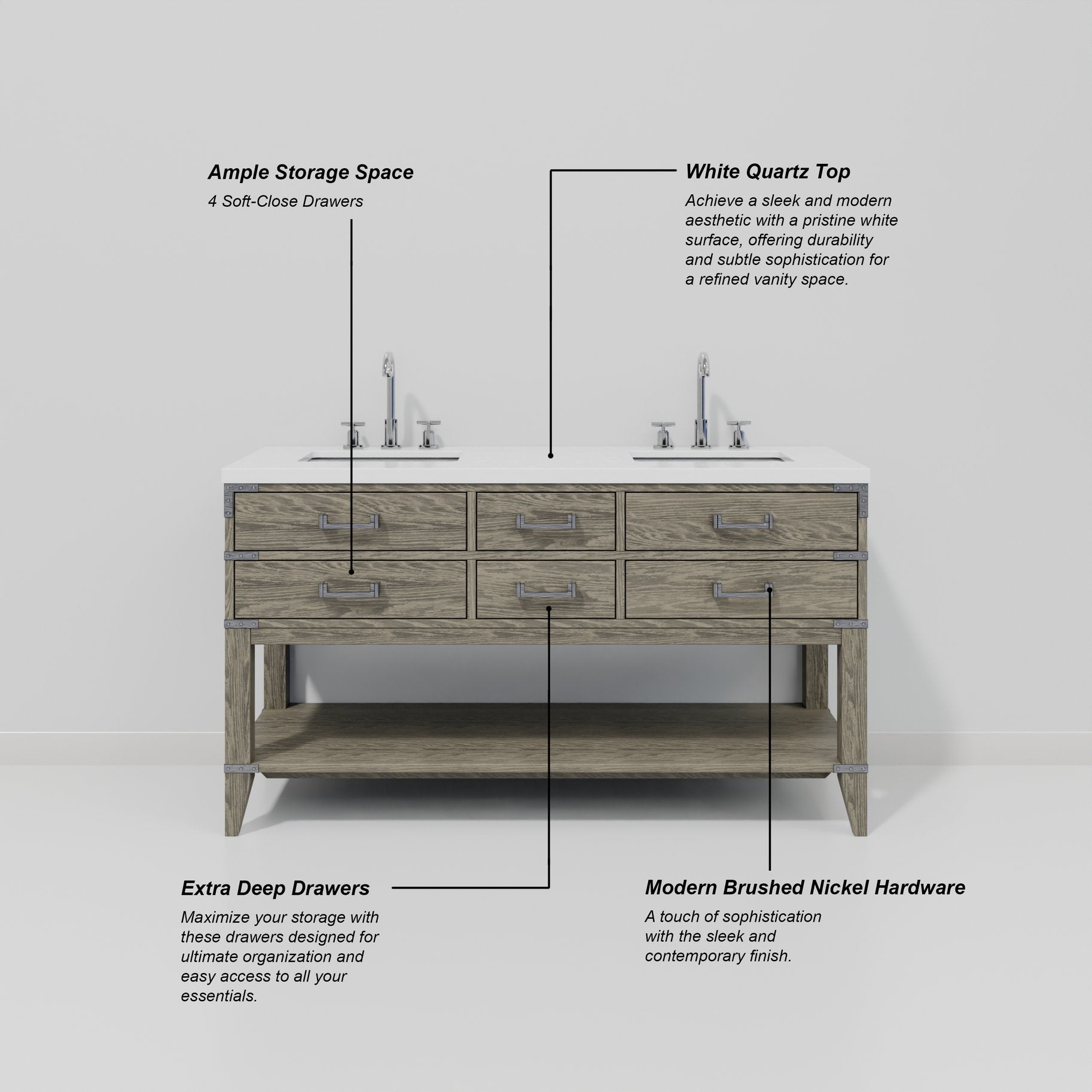 Elevate your bathroom with this modern Grey Oak double vanity, designed for both style and function. The spacious layout, durable white quartz countertop, and included mirrors create a cohesive, high-end look while providing ample storage and thoughtful details like soft-close hardware for everyday convenience.