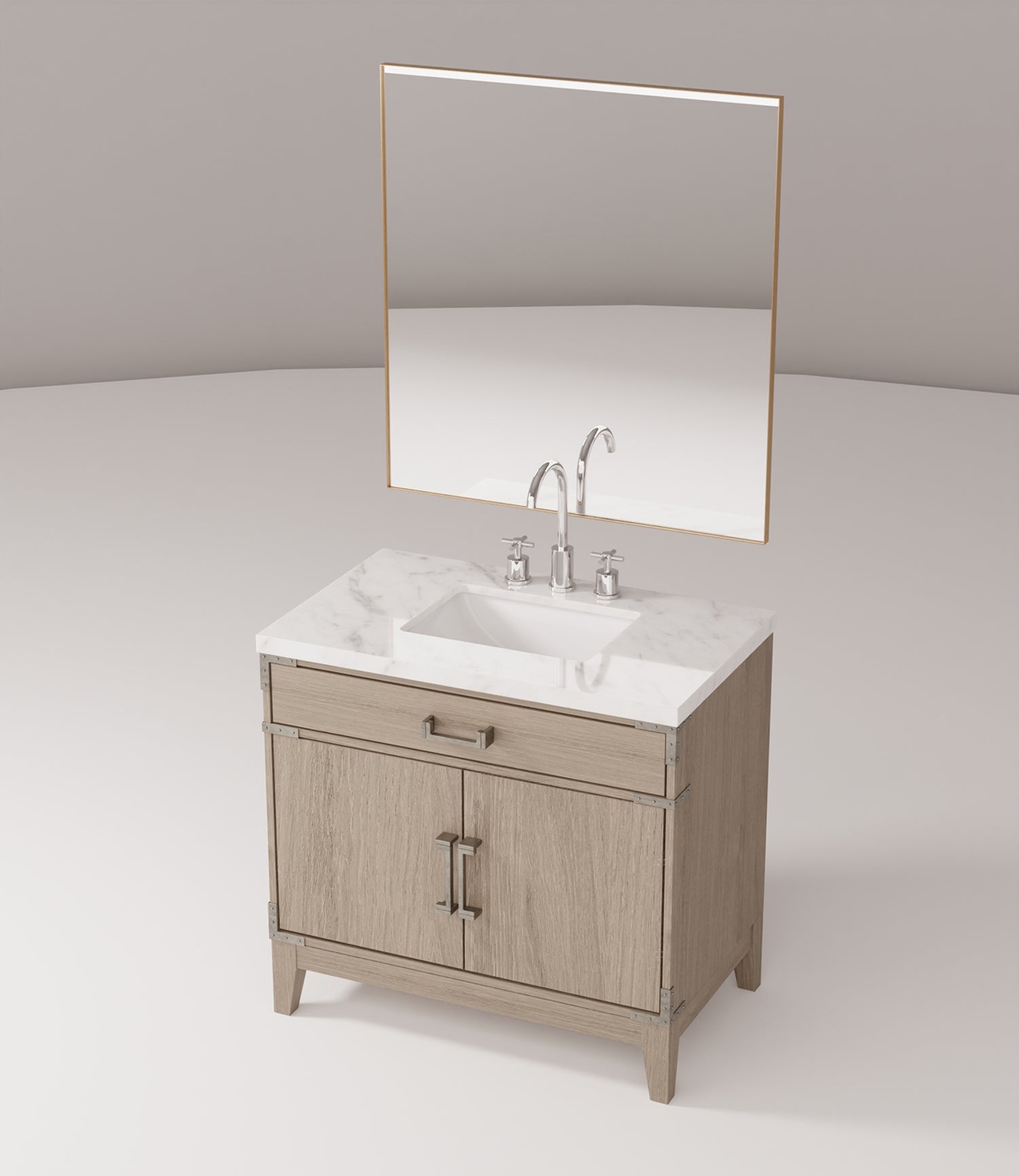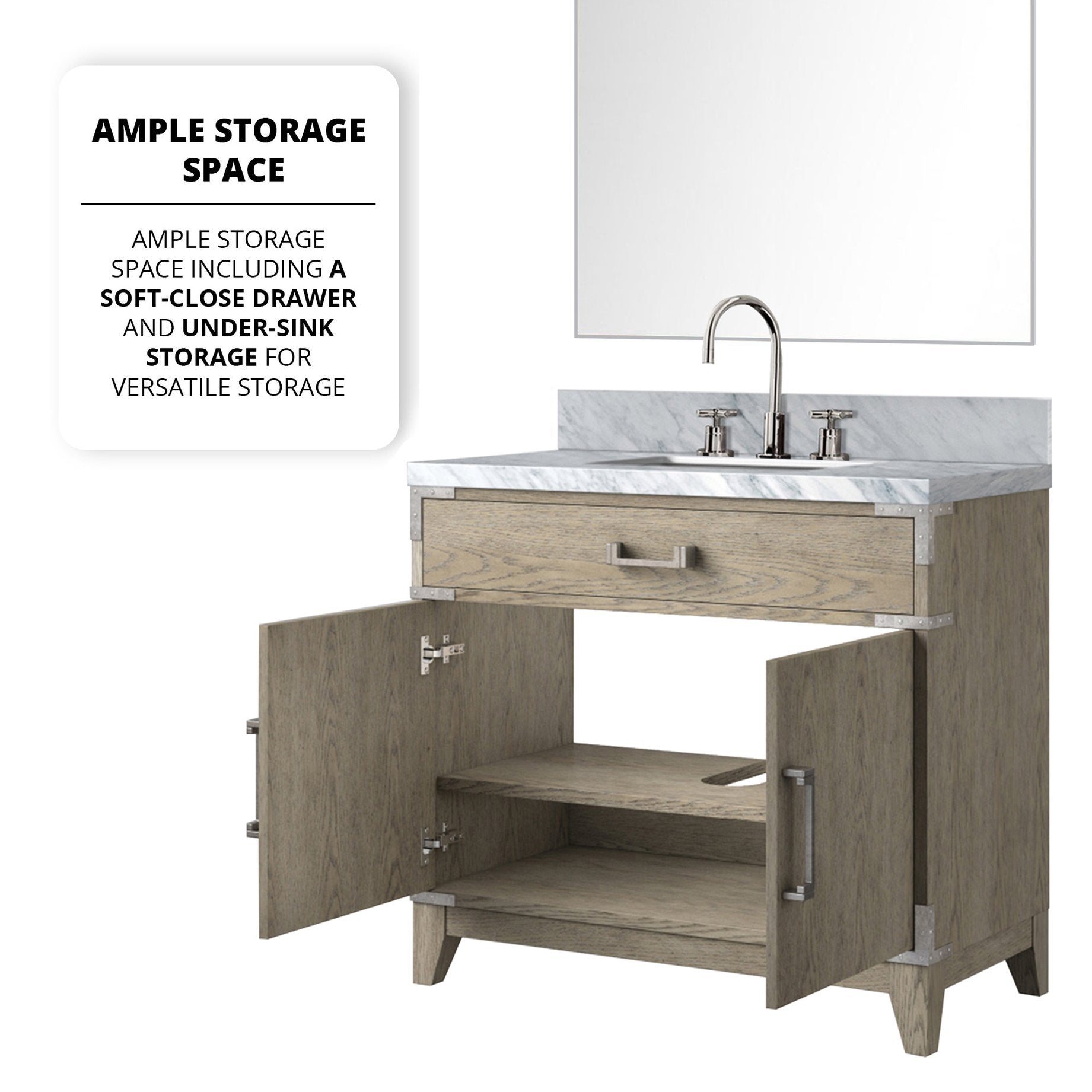 Create a serene and modern focal point for your bathroom with this Grey Oak single vanity set. Thoughtfully designed for both style and function, it pairs a polished Carrara marble countertop with a durable grey oak cabinet, a matching mirror, and a chrome gooseneck faucet — everything you need for a cohesive, move-in-ready installation.