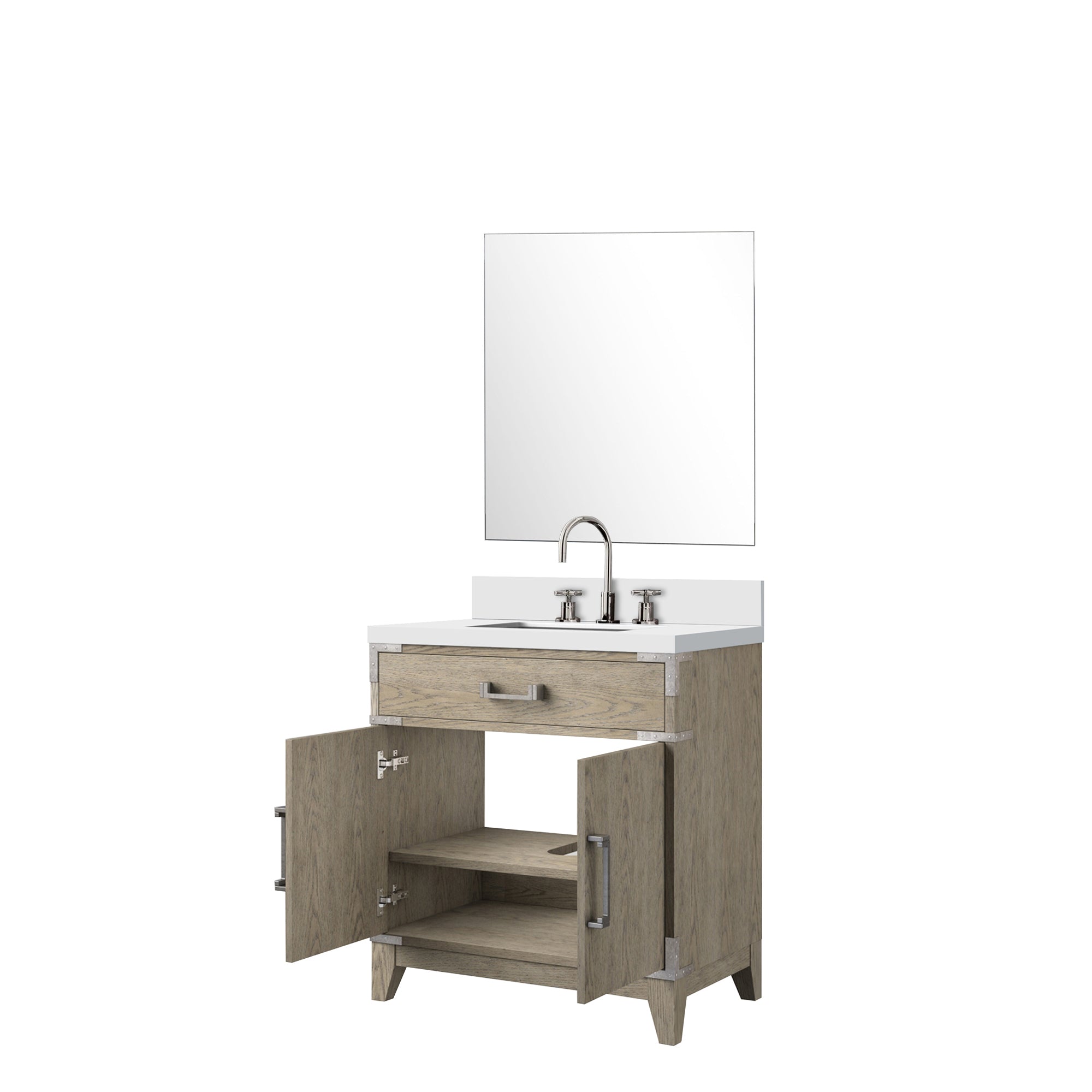- Mirror: Single 28 in. W x 32 in. H mirror included to match the vanity scale