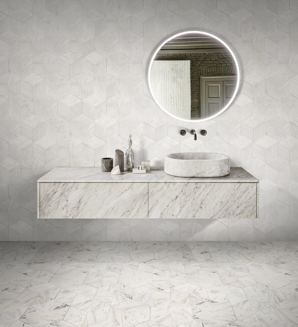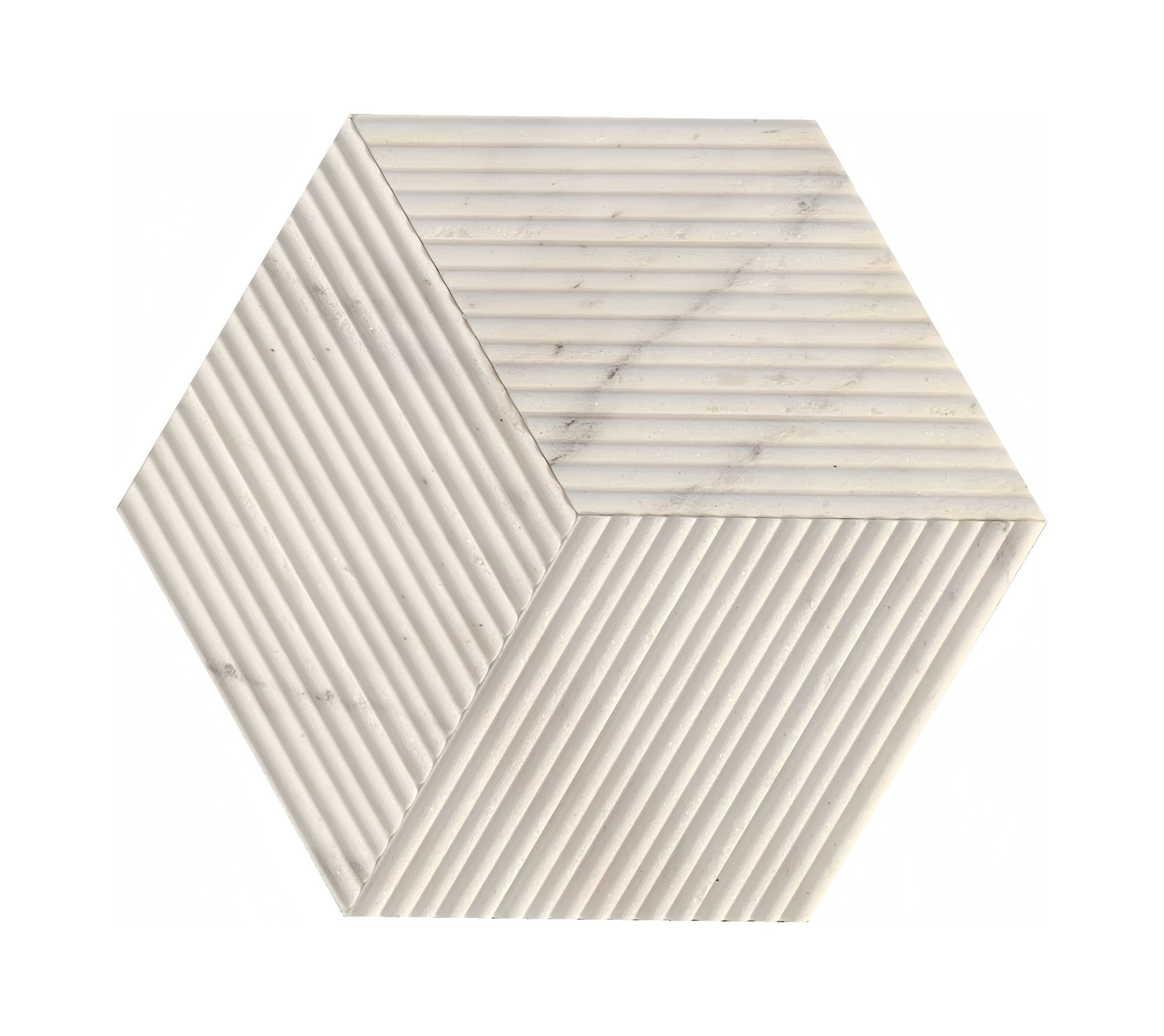 Transform your bathroom into a serene, sculptural retreat with these Hexagon Snow Mountain White textured marble tiles. Crafted from genuine marble with a refined OL textured finish and 3D fluted detailing, each tile adds subtle depth, natural veining, and luxurious tactile interest—perfect for accent walls, shower surrounds, or feature installations where understated elegance matters.