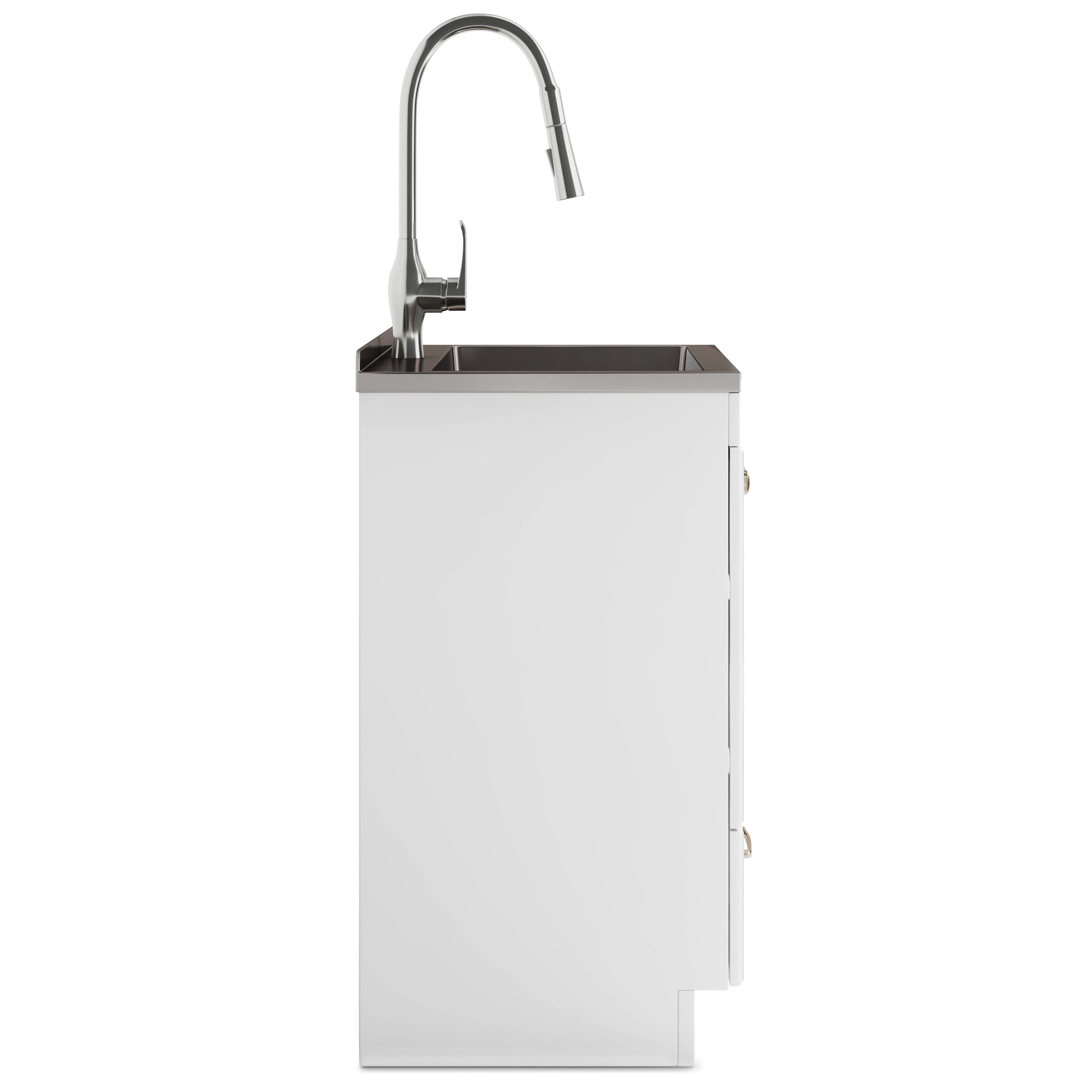 - Dimensions: Cabinet measures 19.7”D x 23.6”W x 34.25”H with an integrated stainless-steel sink and faucet for heavy-duty cleaning tasks.