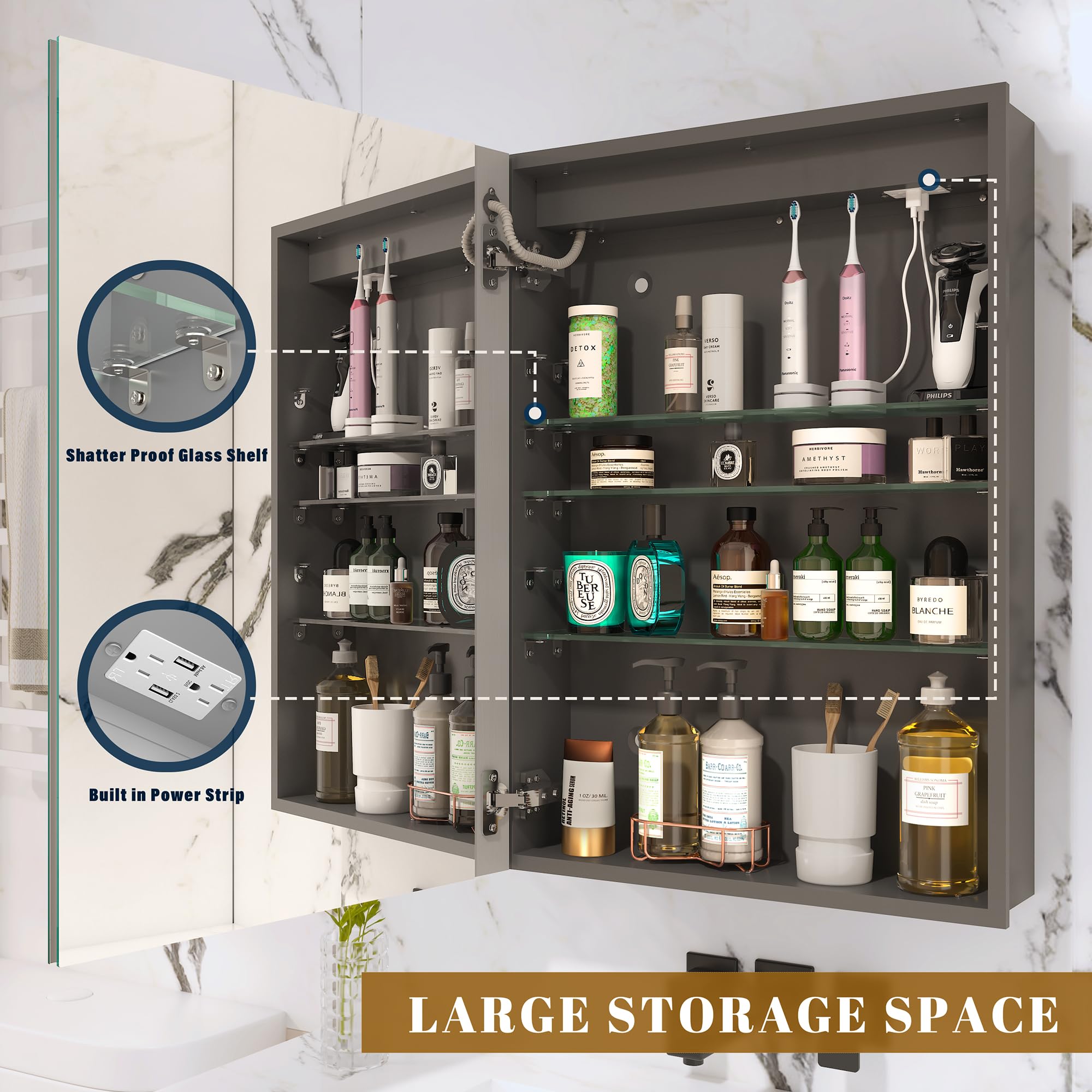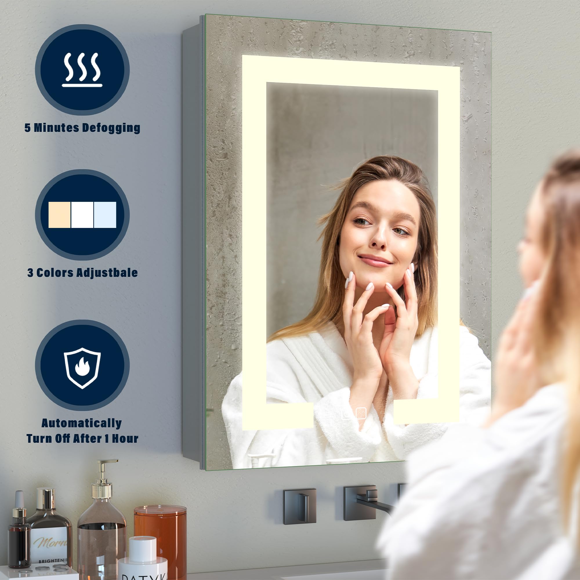 - [Defog Function] The anti-fog function of the bathroom vanity cabinet mirror ensures that it reflects clearly even in humid environments. Turn on 10-15 minutes before the shower, during which you can clearly see your reflection, and it will automatically turn off after 1 hour.