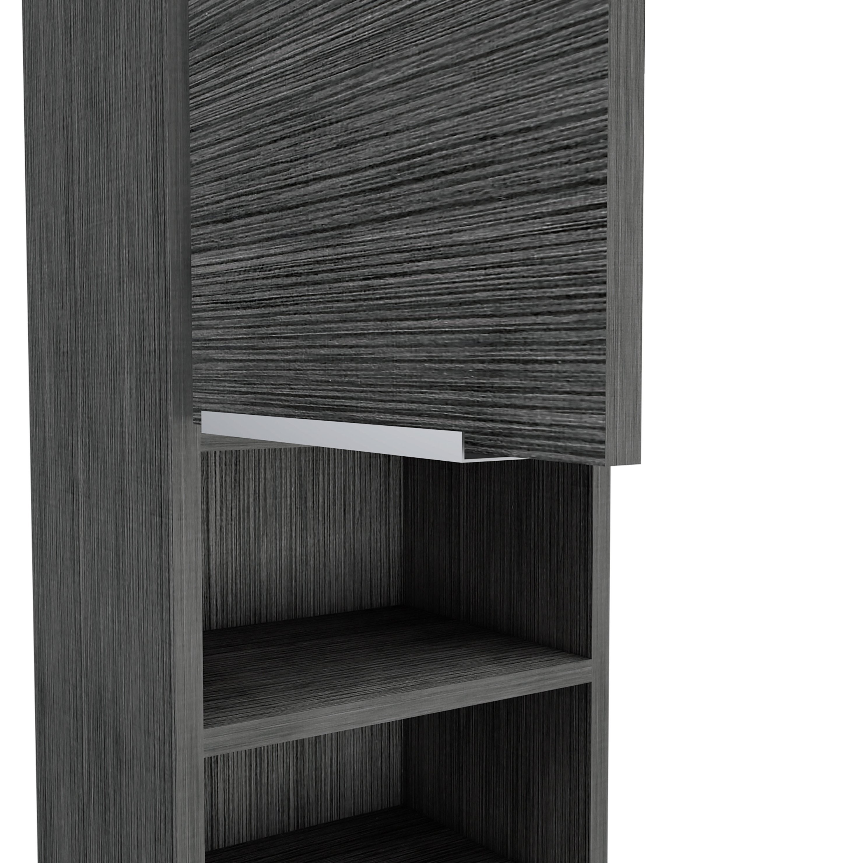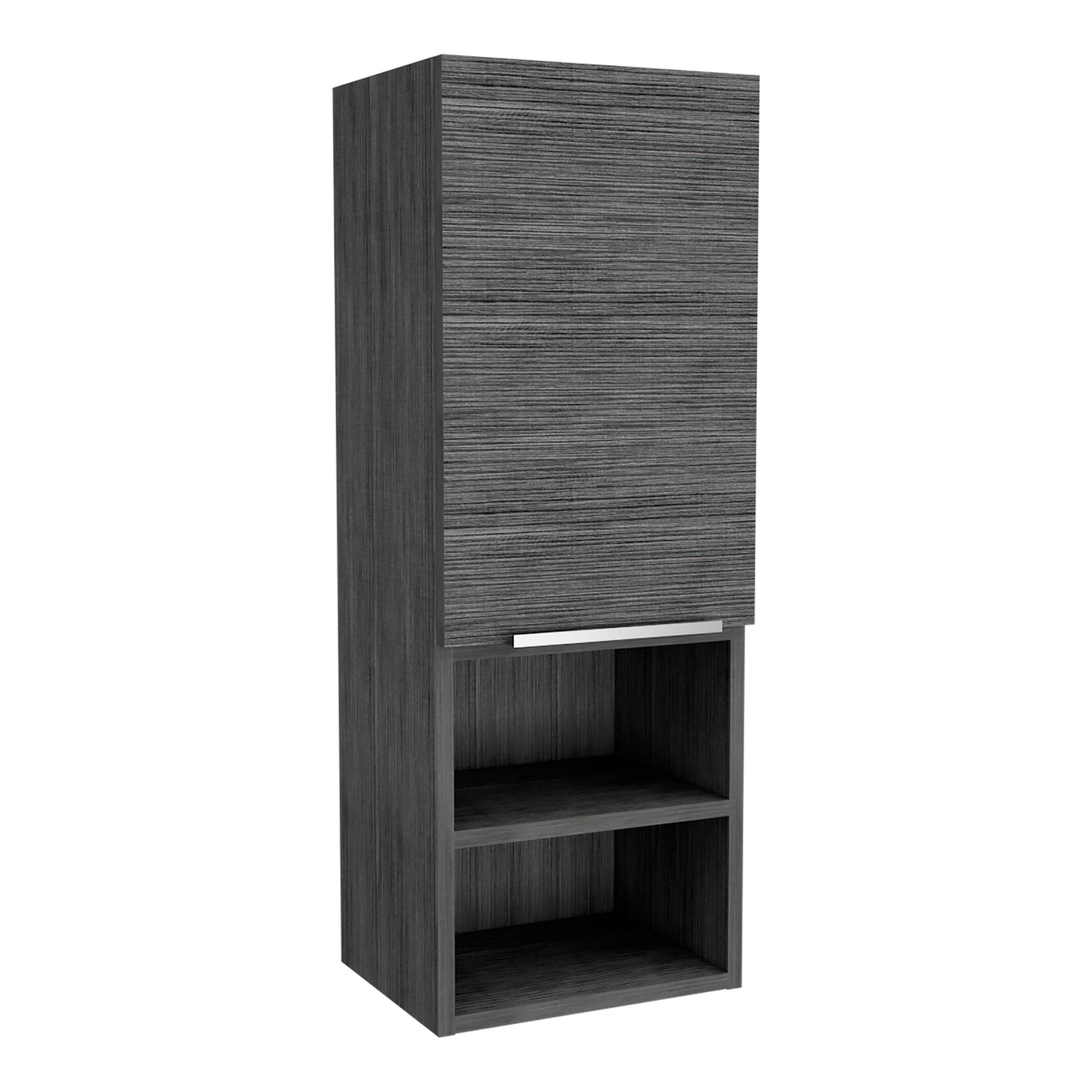 - Storage configuration: One single door cabinet concealing two interior shelves plus two external lower open shelves for items you reach for most