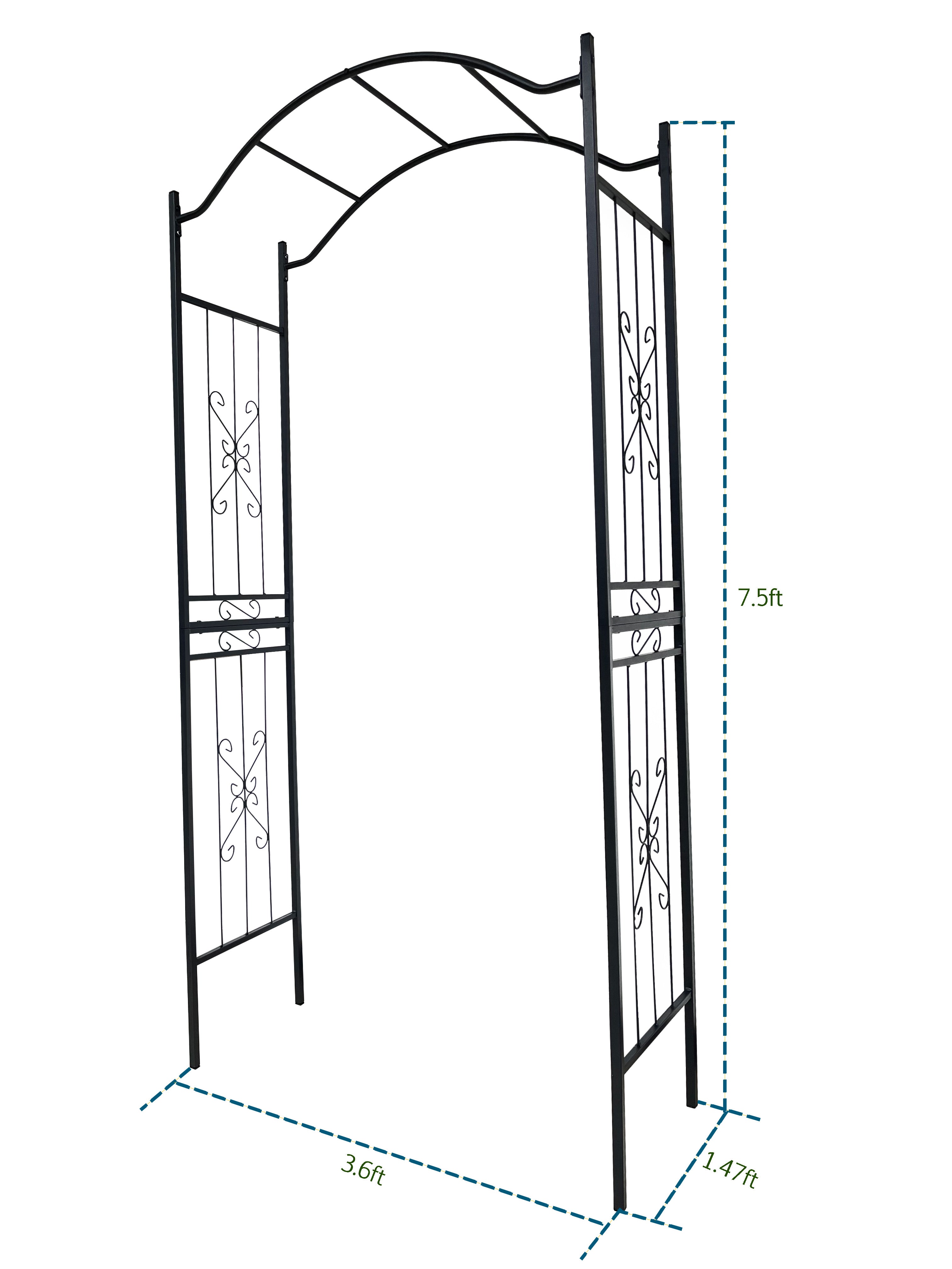 - The Metal Garden Arch is curvaceous , which brings style to your garden and walkway. It is also perfect as a graceful archway into your garden or a special corner.The size is 3.6ft Length x 1.47ft Width x 7.5ft Height.