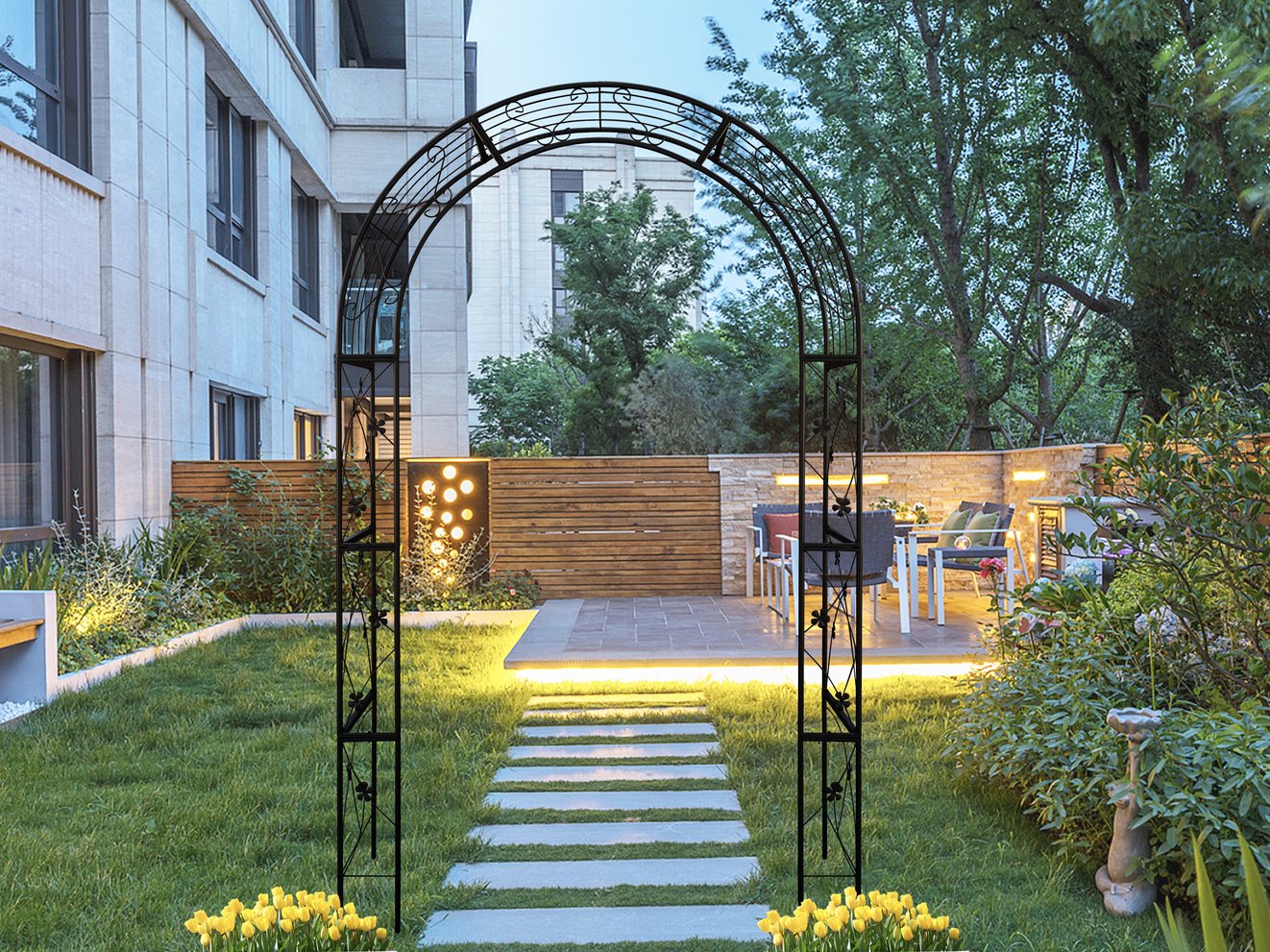 Transform your outdoor space with this elegant and durable metal garden arch — perfect for creating a focal point for climbing plants, framing garden paths, or adding a decorative touch to weddings and events. Its sturdy iron construction and powder-coated finish ensure long-lasting outdoor performance, while the open trellis design encourages healthy vine growth and easy plant training.