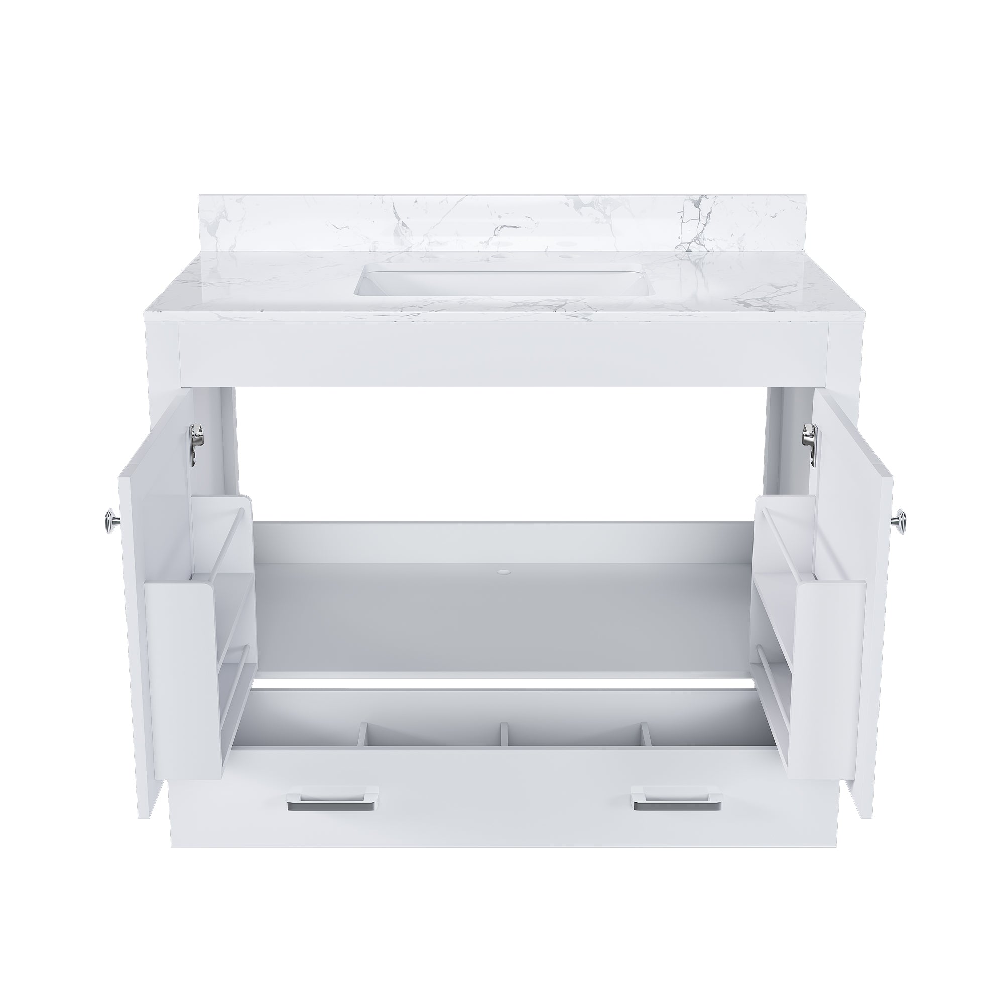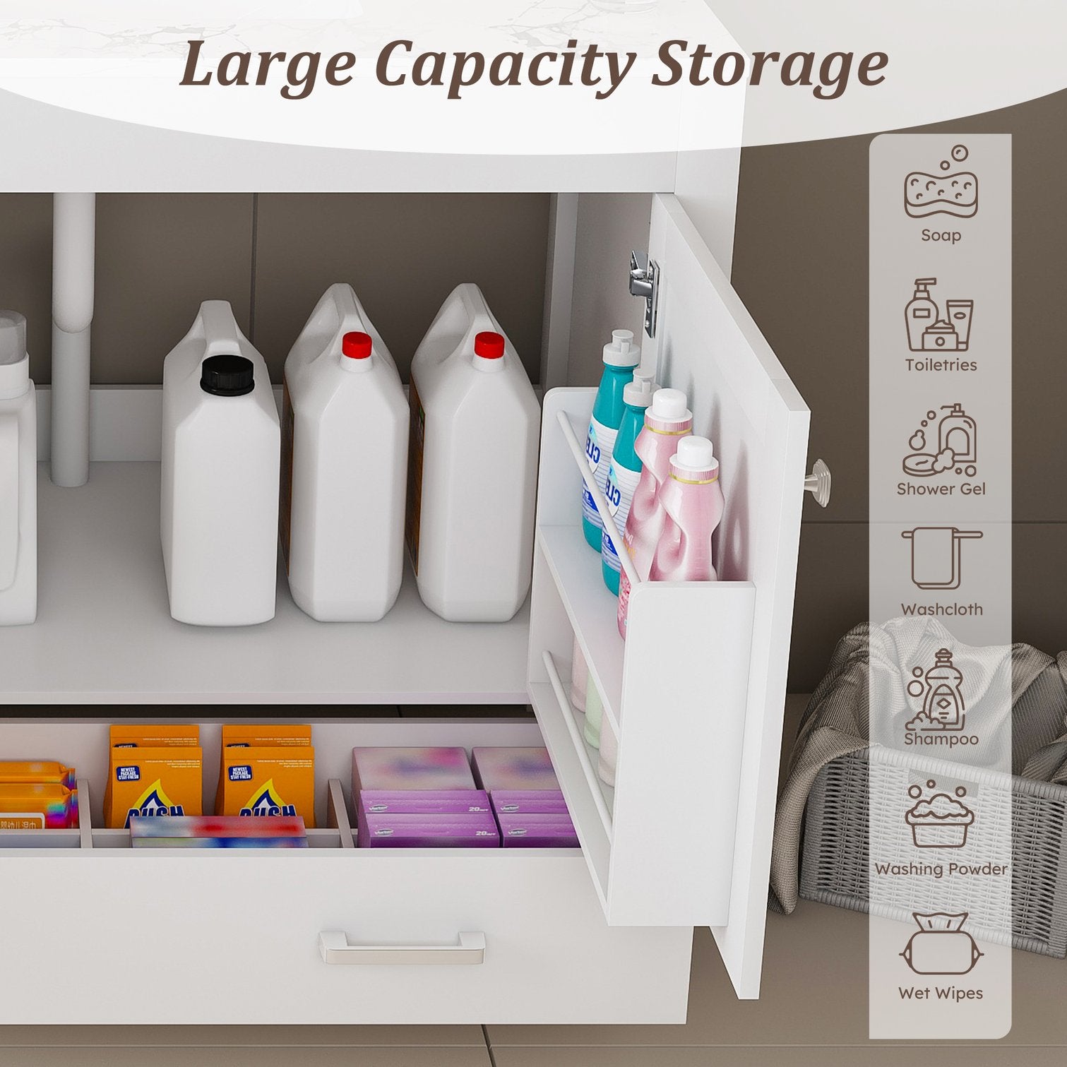 - Ample storage space: The bottom of the bathroom vanity is equipped with separate drawers. Carefully designed compartments allow you to neatly arrange bathroom supplies. The cabinet doors have built-in shelves for storing items, keeping the bathroom clean and organized. The divided design enables you to easily manage the entire bathroom space.