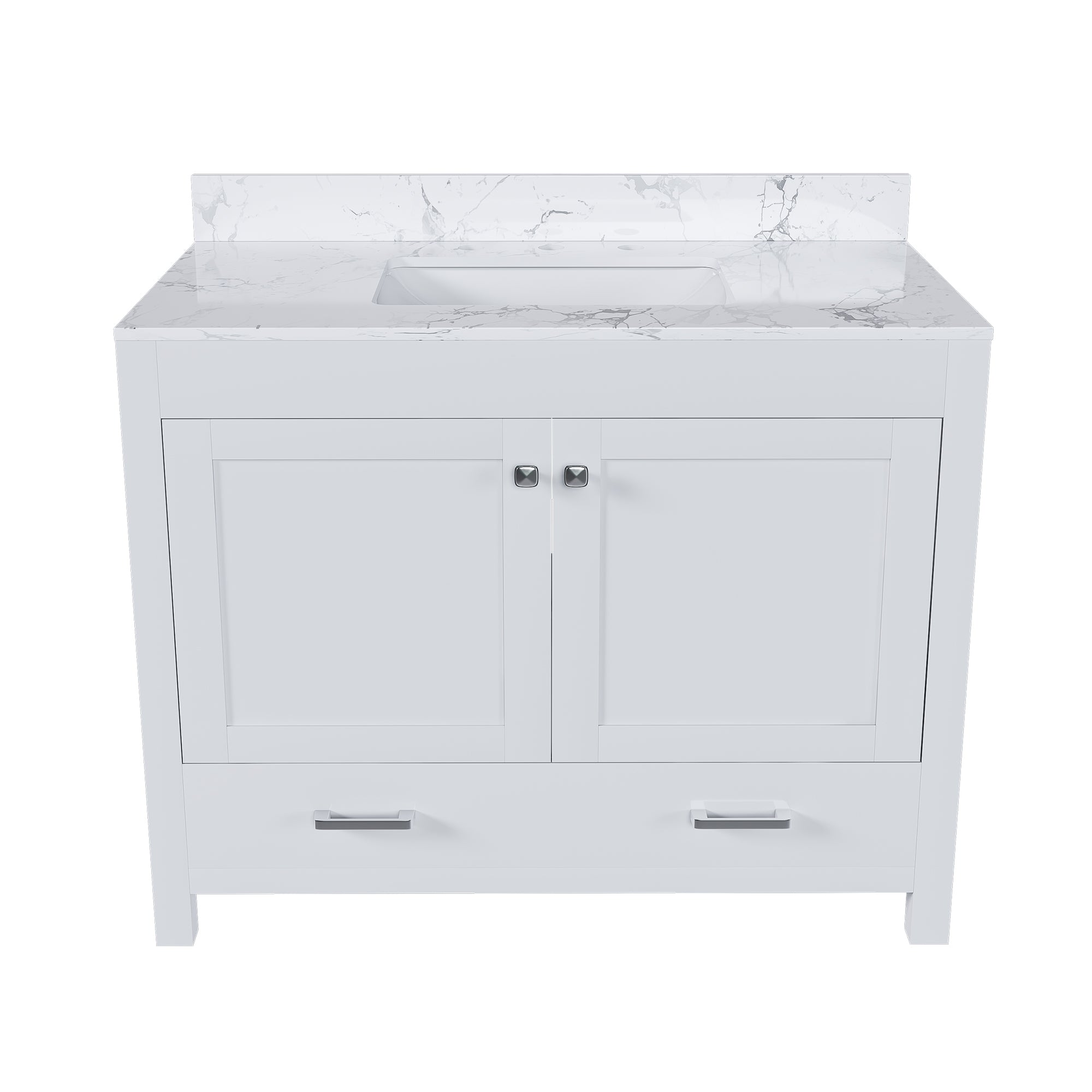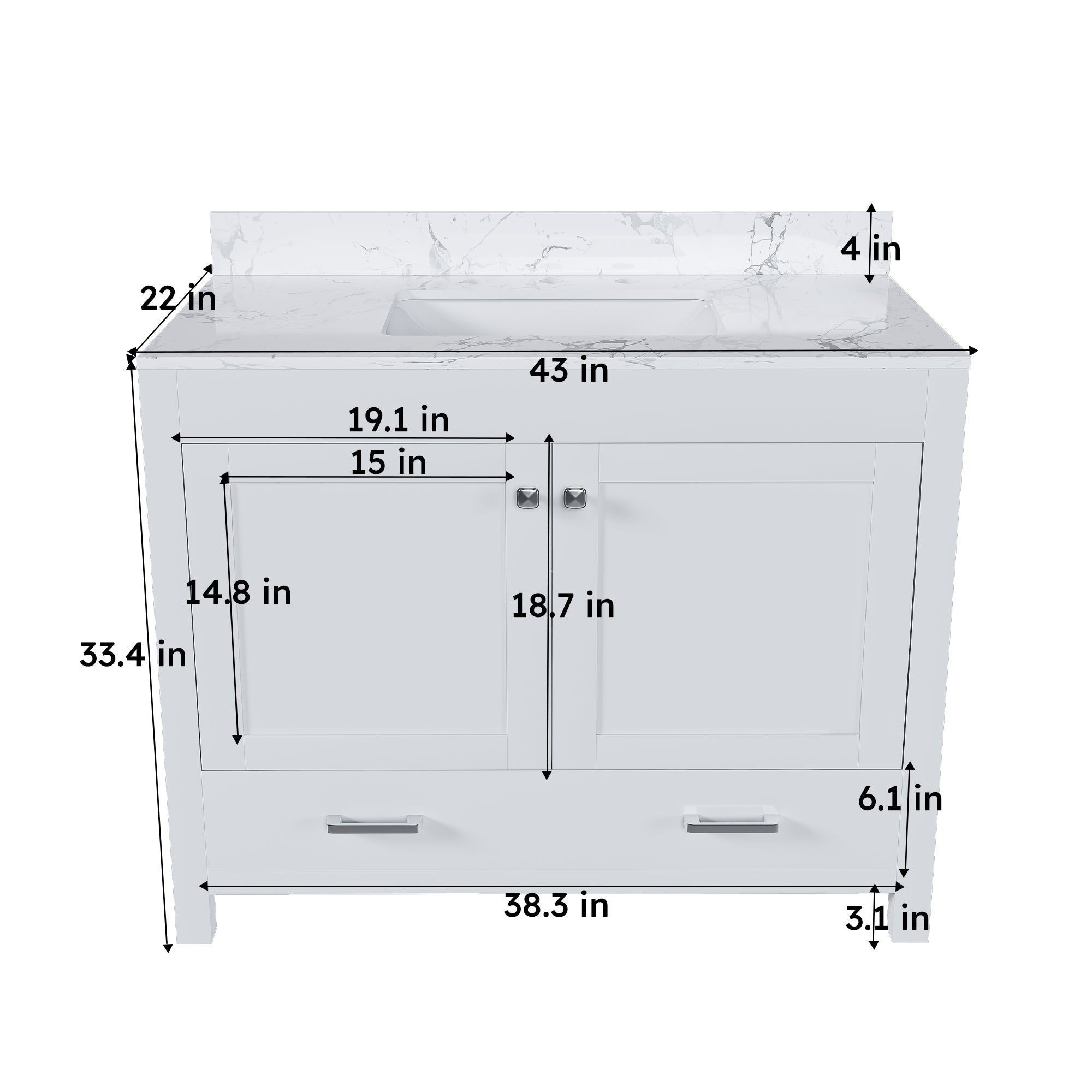 - Top: Carrara white artificial marble-style countertop with three faucet holes; pairs well with a 43 x 22 inch ceramic sink (sold separately)
