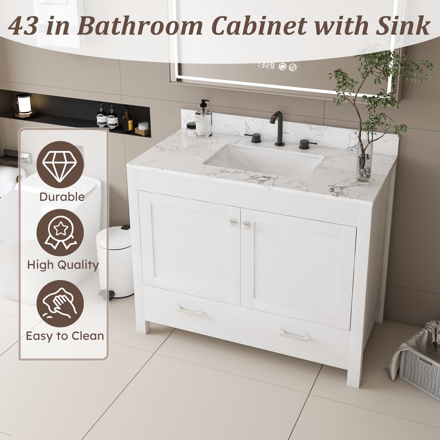 - Fashionable and practical: The bathroom vanity can be paired with a 43*22-inch ceramic sink. The pre-drilled holes of the ceramic sink simplify the installation of the faucet, enhancing the usability of the vanity cabinet without affecting the style.