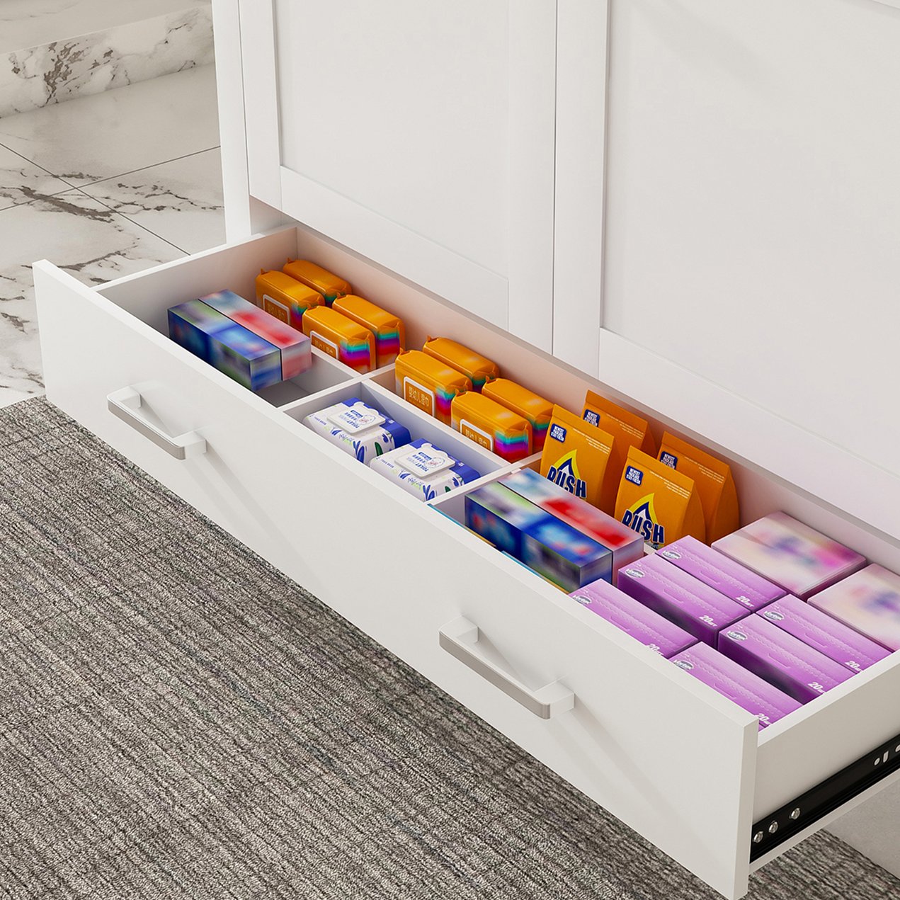 - Hardware: Adjustable silent hinges and soft-closing drawer slides reduce noise and protect stored items from impact