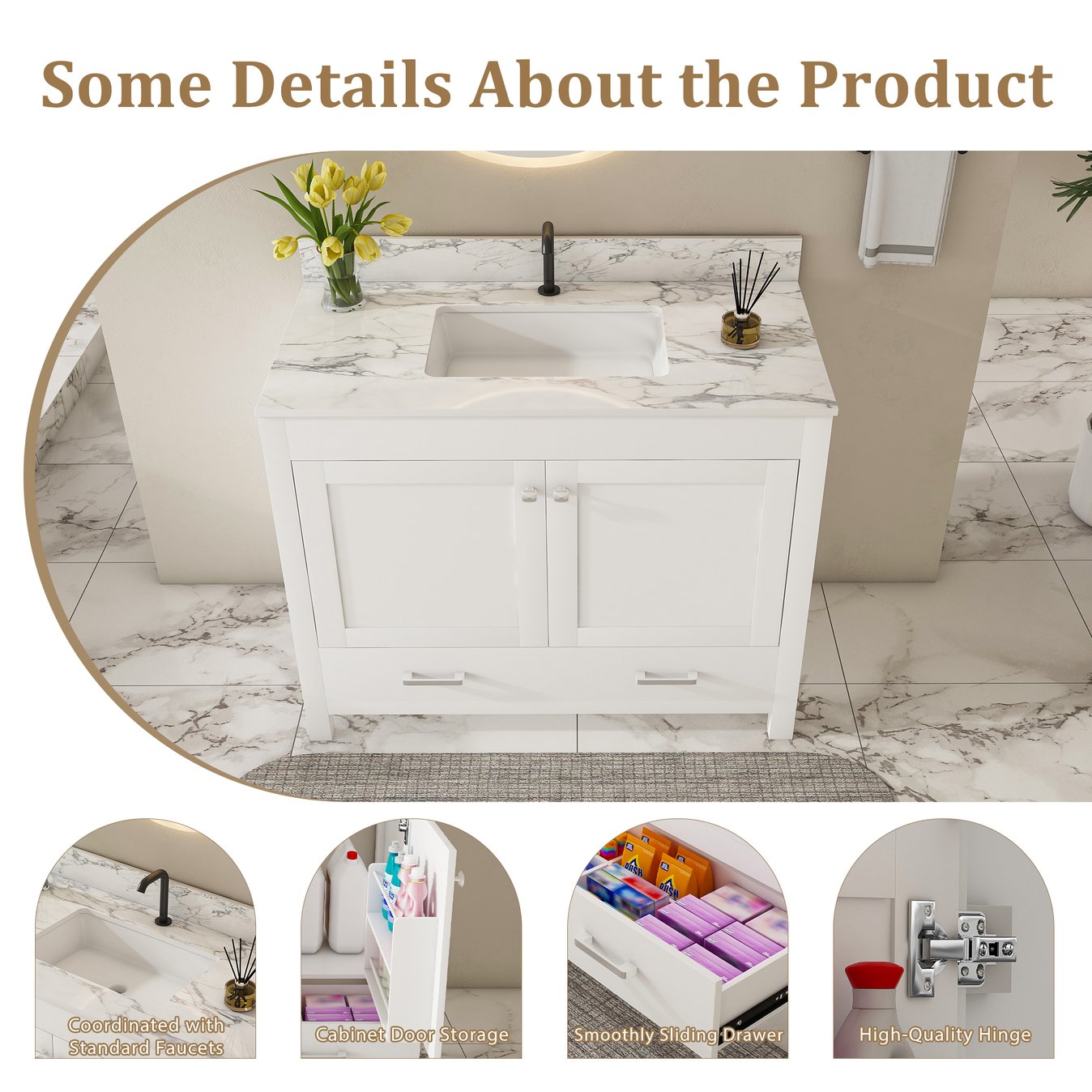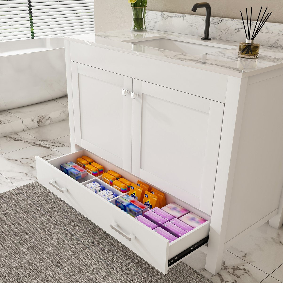 - Ample storage space: The bottom of the bathroom vanity is equipped with separate drawers. Carefully designed compartments allow you to neatly arrange bathroom supplies. The cabinet doors have built-in shelves for storing items, keeping the bathroom clean and organized. The divided design enables you to easily manage the entire bathroom space.