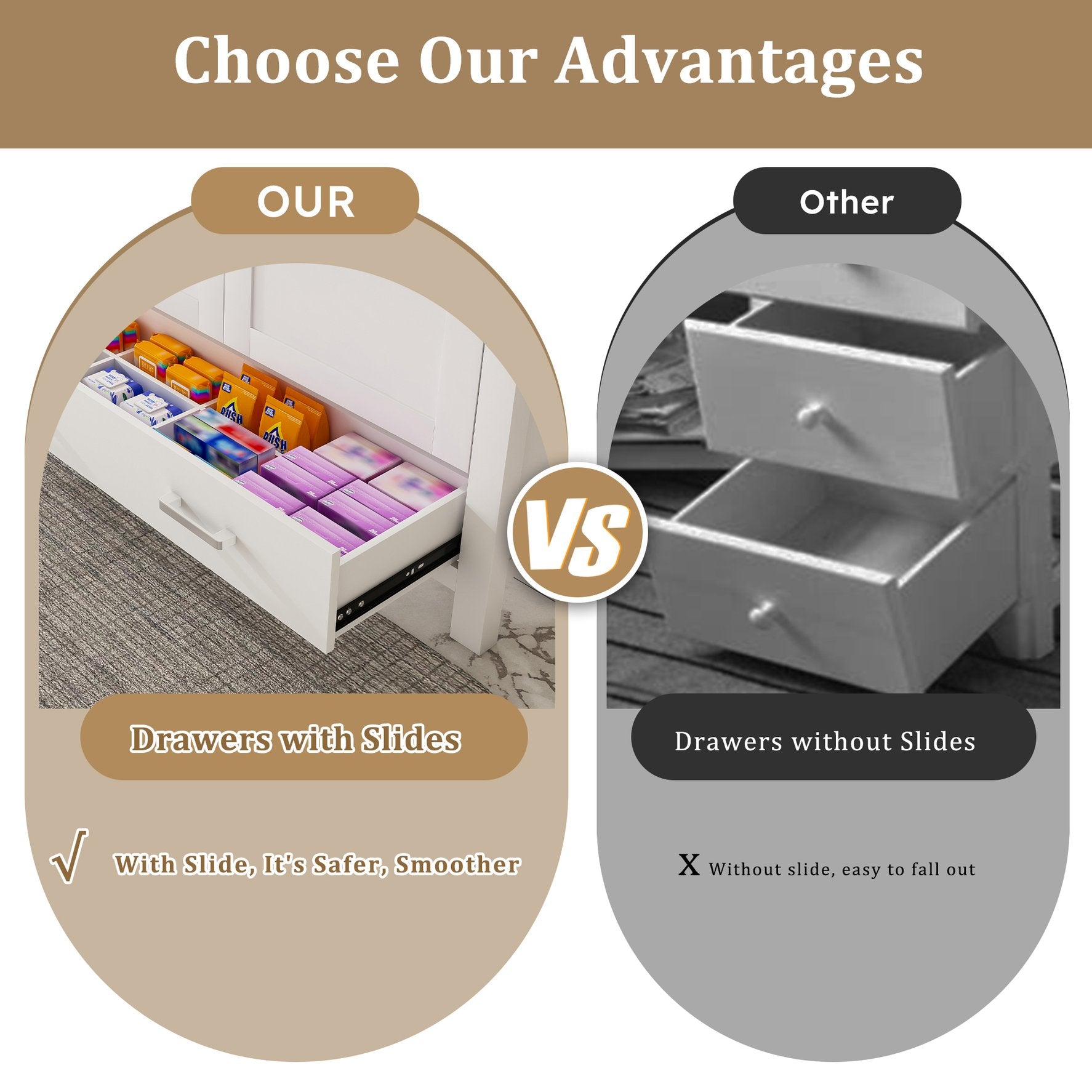 - Silent hinges and sliding rails: This bathroom vanity table is equipped with adjustable silent hinges and soft-closing drawer rails, ensuring that the bathroom cabinet operates quietly and protecting the items in the vanity cabinet from damage.